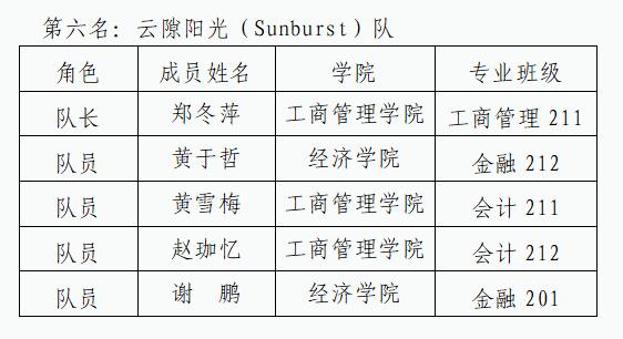 我校共有34支队伍参加,经过初赛、复赛、半决赛的重重筛选,有16支队伍进入复赛,8支队伍进入半决赛,3支队伍获得总决赛资格。按照每所院校最多2支队伍进入总决赛的规则,我校选派“光宗耀祖”队与“云隙阳光”队参赛。两支队伍由范伟、陈伟宏、唐秋鸿、施冬冬、劳可夫等老师指导,参赛队员来自工商管理学院和经济学院。比赛中,同学们顽强拼搏、沉着应战,表现出良好的专业能力,也充分展现了我校在此项赛事的实力与风采。