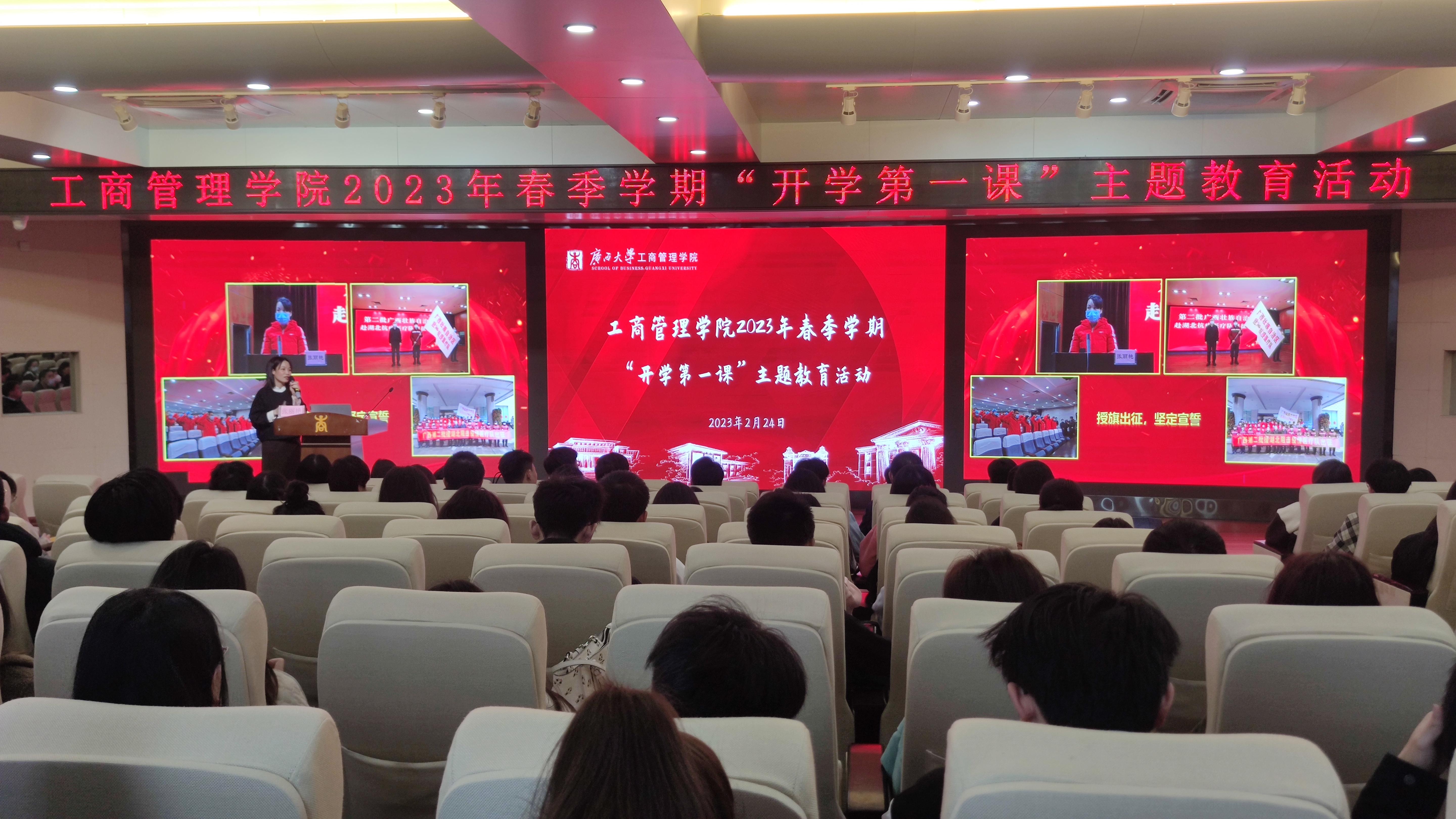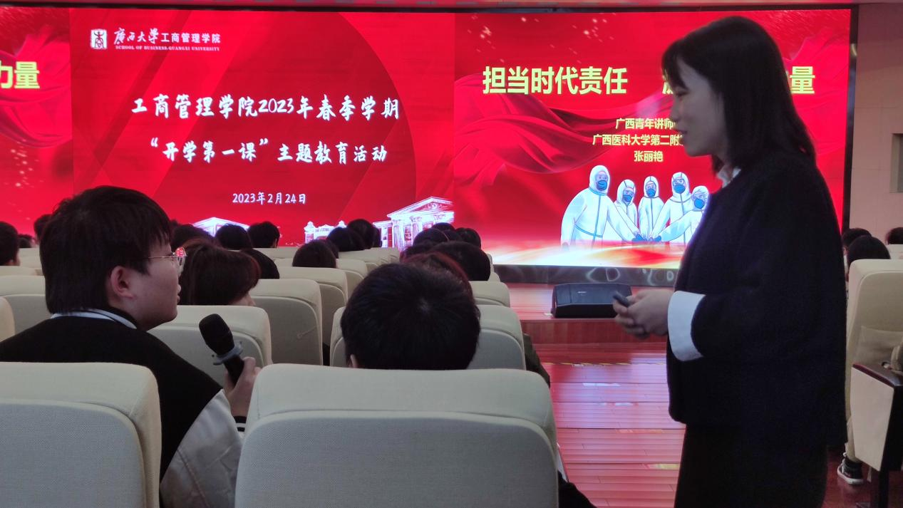 2月24日,广西医科大学第二附属医院团委书记、共青团广西区委兼职副书记张丽艳受邀到我院以《担当时代责任,激扬青春力量——学习贯彻党的二十大精神专题报告》为题,为我院师生代表、校团学组织学生干部代表讲授“开学第一课”。校团委书记谢能重出席活动。报告会由工商管理学院党委副书记黄晋主持,院团委书记马丽娟以及全体辅导员老师参加活动。本次活动得到了校团委的大力支持,60多名校会学生干部与我院200余名师生共同聆听“开学第一课”。