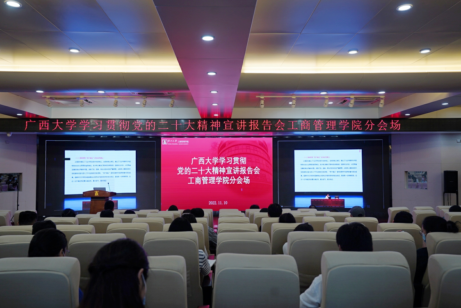 11月10日下午,学习贯彻党的二十大精神自治区宣讲团在我校宣讲,自治区宣讲团成员、自治区党校(广西行政学院)常务副校(院)长胡建华作了宣讲报告。宣讲报告会以线上线下相结合的形式召开,自治区政协副主席、校党委书记王乃学主持报告会。我院在128报告厅设置分会场,教职工及各党支部代表在分会场观看报告会直播。