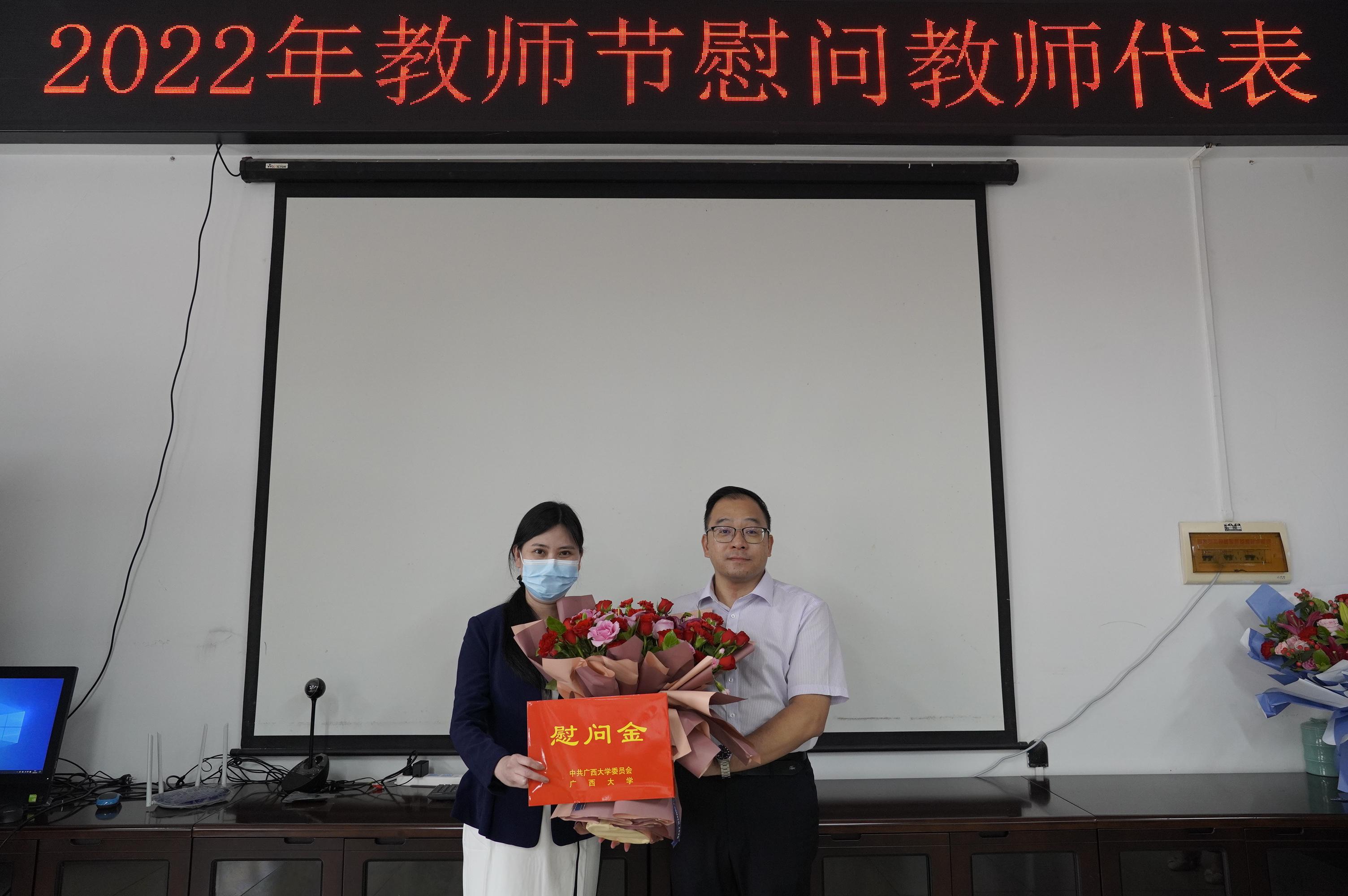 在第38个教师节和中秋佳节到来之际,9月9日上午,在学校的统一安排下,我院党委书记罗诚受学校委托慰问朱帮助、黎鹏、韦荷琳三位老师,为他们送上了鲜花、节日祝福和慰问金,传达学校对广大教职员工的关心厚爱。接受慰问的三位教师代表对学校的关心表示衷心感谢,表示会潜心教育,积极科研,奋勇争先做好本职工作,为学院、学校事业发展添砖加瓦、增光添彩。