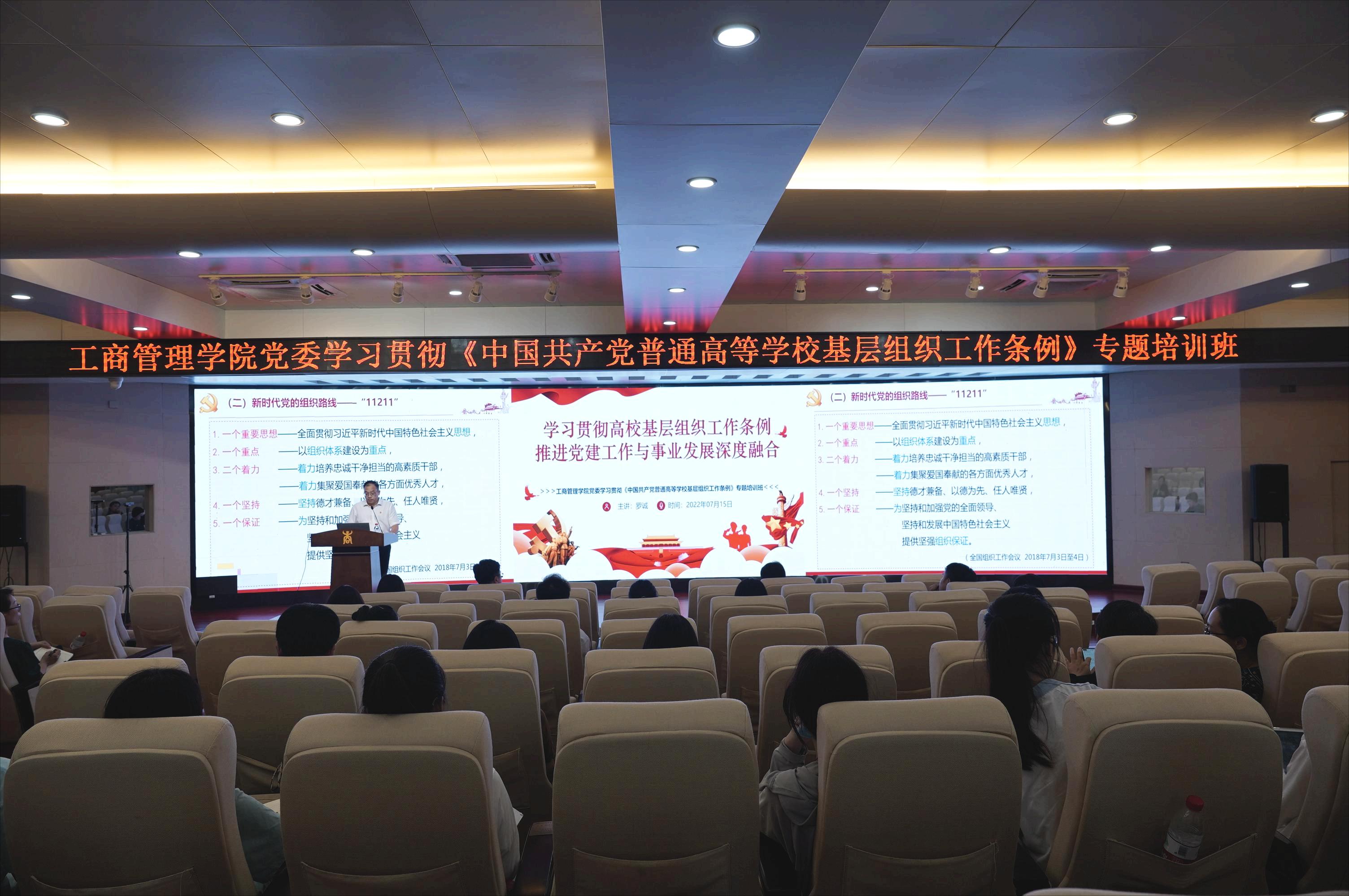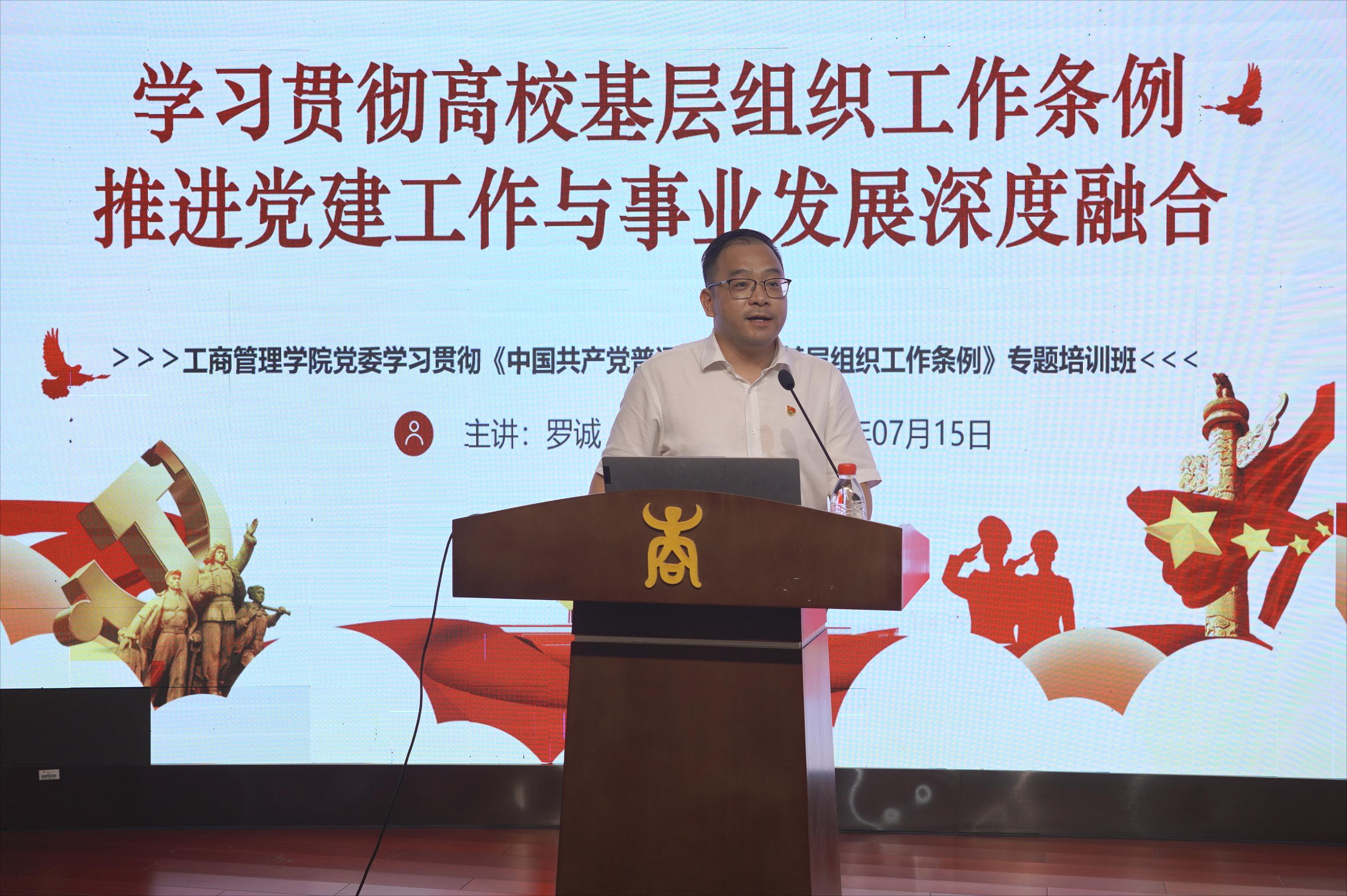7月15日下午,我院党委学习贯彻《中国共产党普通高等学校基层组织工作条例》(以下简称《条例》)专题培训班在128报告厅举办,院党委书记罗诚作题为《学习贯彻高校基层组织工作条例推进党建工作与事业发展深度融合》的专题辅导讲座。讲座由院党委副书记、纪委书记黄晋主持,学院全体教工党支部和学生党支部书记、副书记、委员及全体辅导员参加。