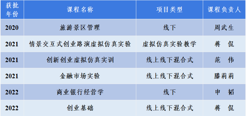2022年6月10日,广西教育厅发布《自治区教育厅关于公布第三批自治区级一流本科课程名单的通知》(桂教高教〔2022〕30号),我院申韬教授负责的《商业银行经营学》、蒋侃教授负责的《创业基础》两门课程获批第三批自治区级一流本科课程。截至目前,我院共获得自治区级一流本科课程6门。