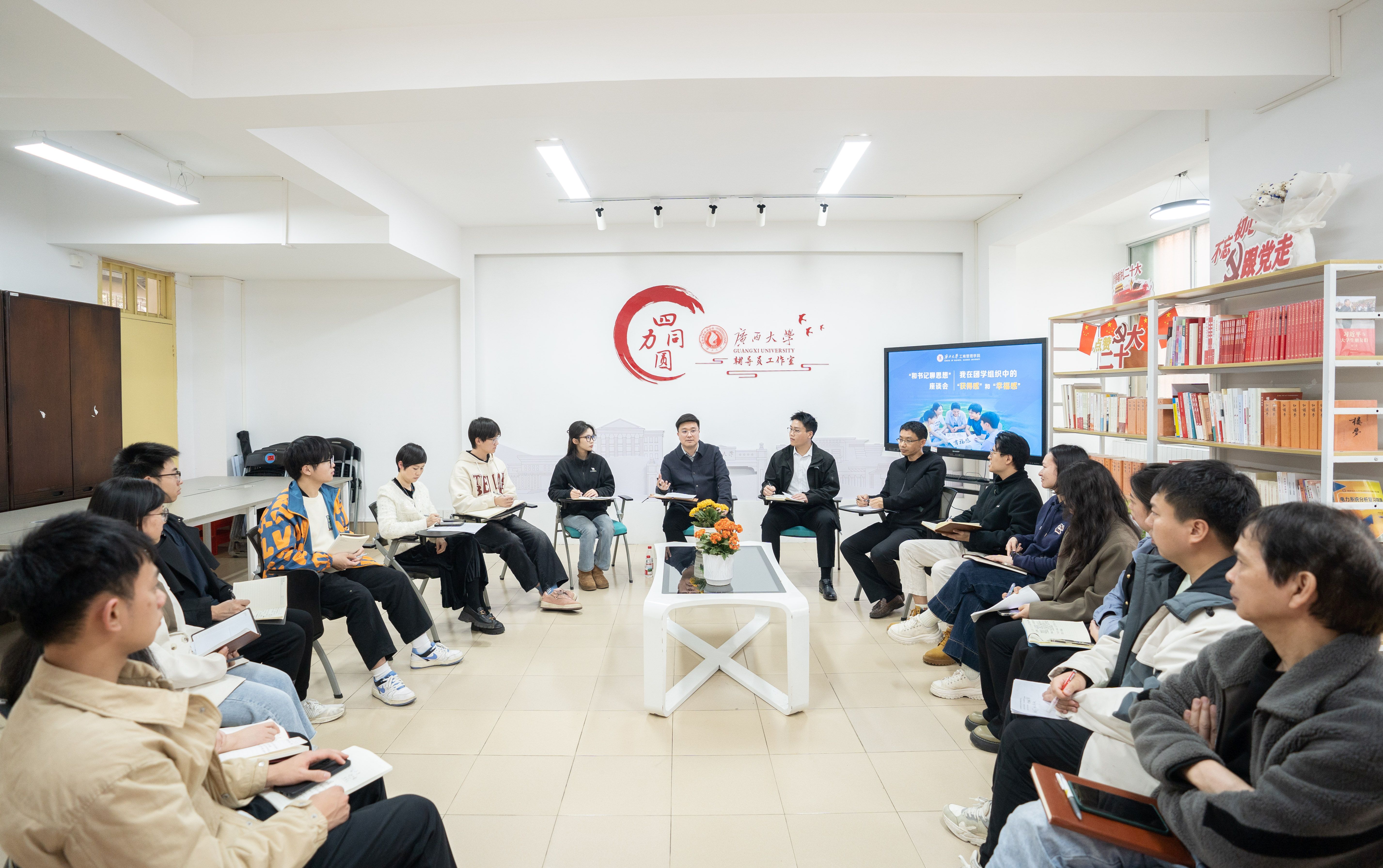 3月19日下午,院党委书记黄晋走进西校园6B学生宿舍一楼(“四力同圆”辅导员工作室),与我院学生干部代表围坐一堂,畅谈团学组织中的“获得感”和“幸福感”。学院党委副书记肖克宁参加座谈会。