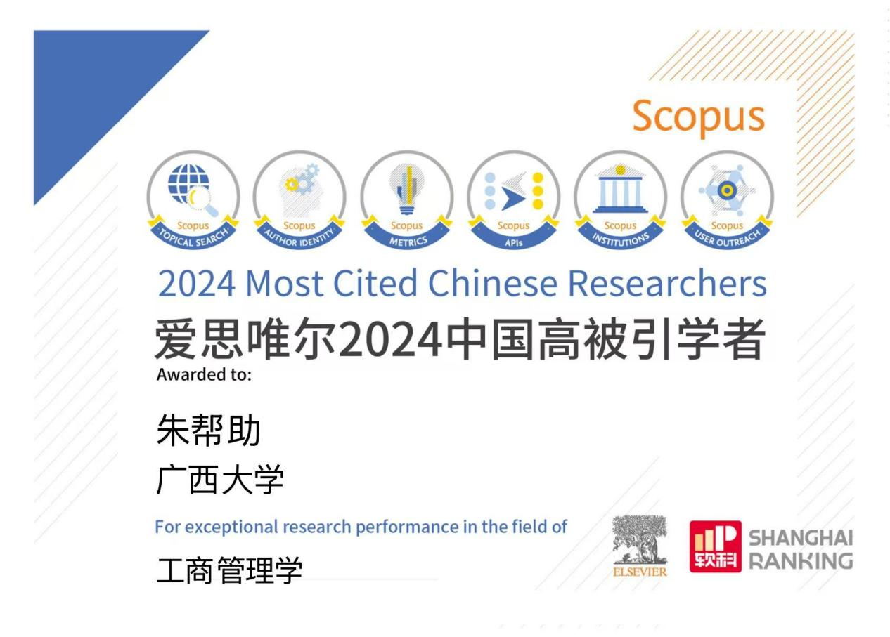 3月25日,爱思唯尔(Elsevier)发布2024“中国高被引学者”(Highly Cited Chinese Researchers)榜单,本次国内共有来自547所高校、企业及科研机构的6388位学者入选,覆盖了教育部10个学科领域、83个一级学科。我院朱帮助教授再次入选,实现了2021-2024年连续四年登榜,彰显其在工商管理学领域的显著学术影响力。