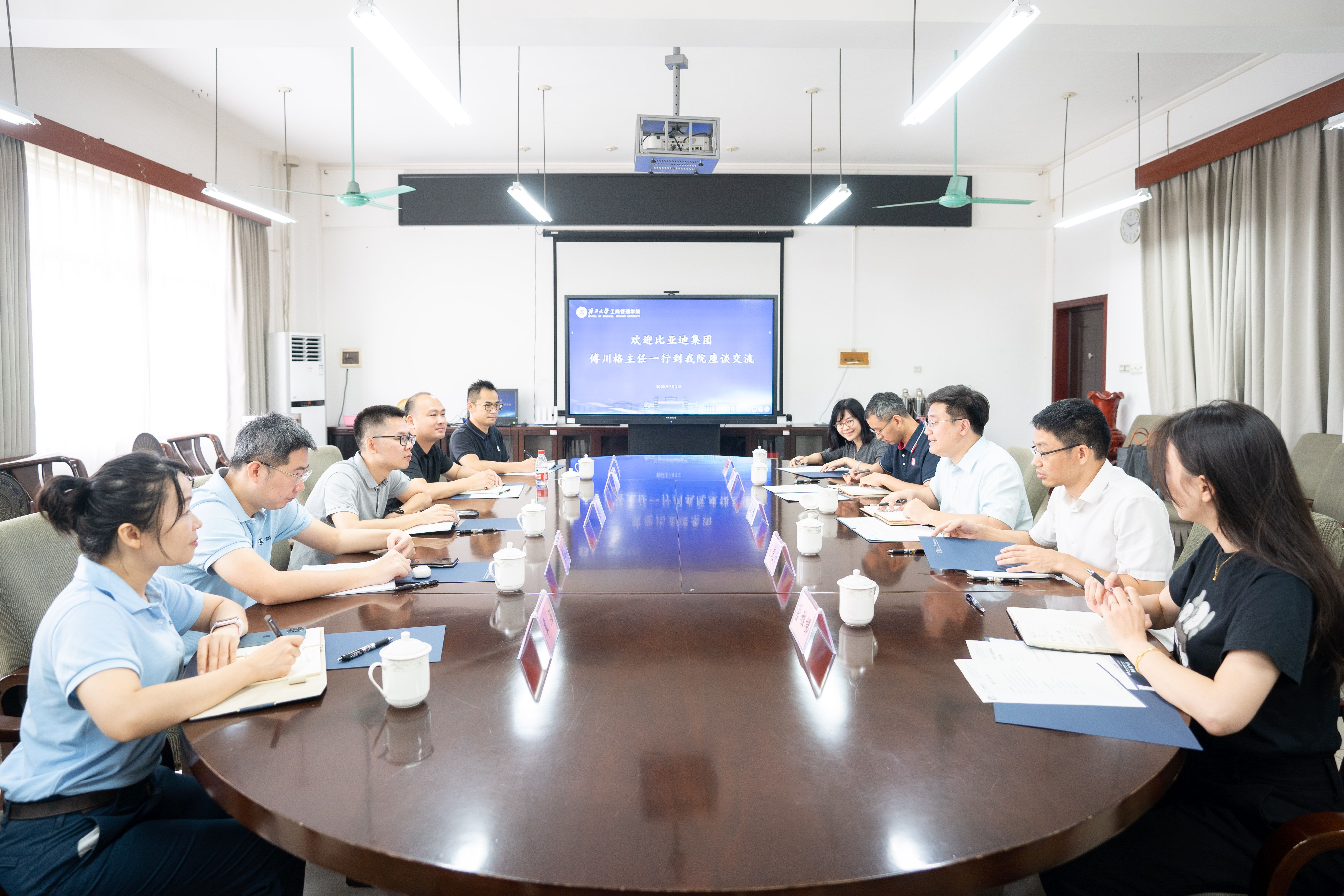 7月2日上午,比亚迪集团总裁办公室政府事务主任傅川格一行5人到我院调研,就新能源行业发展和人才需求、深化校企合作事宜进行专题座谈交流。学院党委书记黄晋、党委副书记肖克宁、企业管理系副主任刘会民等出席座谈会。