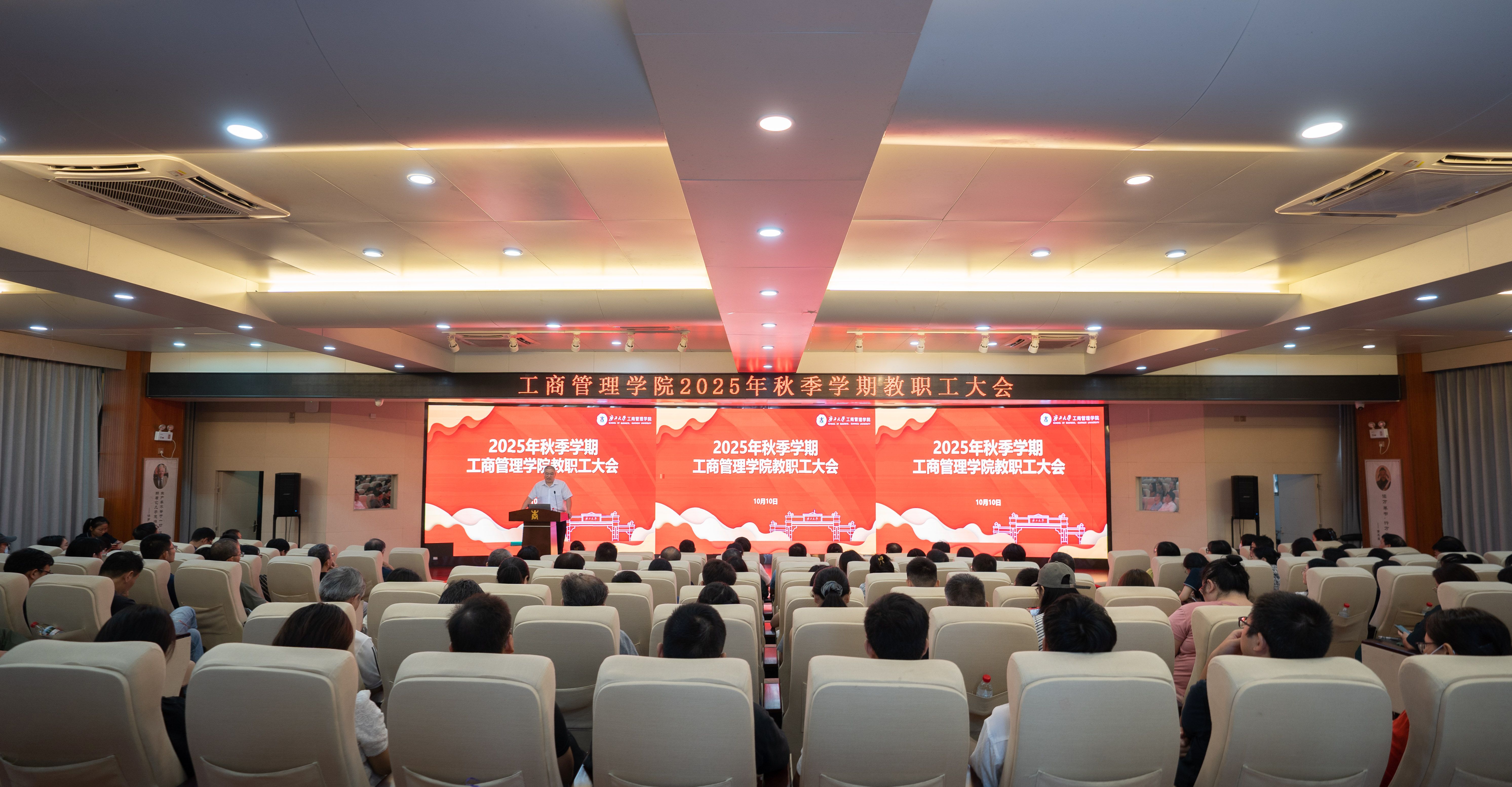 10月10日下午,我院在学院128报告厅召开2025年秋季学期教职工大会,就新学期重点工作进行安排部署。学院党委书记黄晋、院长朱帮助、党委副书记肖克宁,副院长朱少英、申韬、廖东红、韦铁出席会议,全体教职工参加了会议。会议由朱帮助主持。