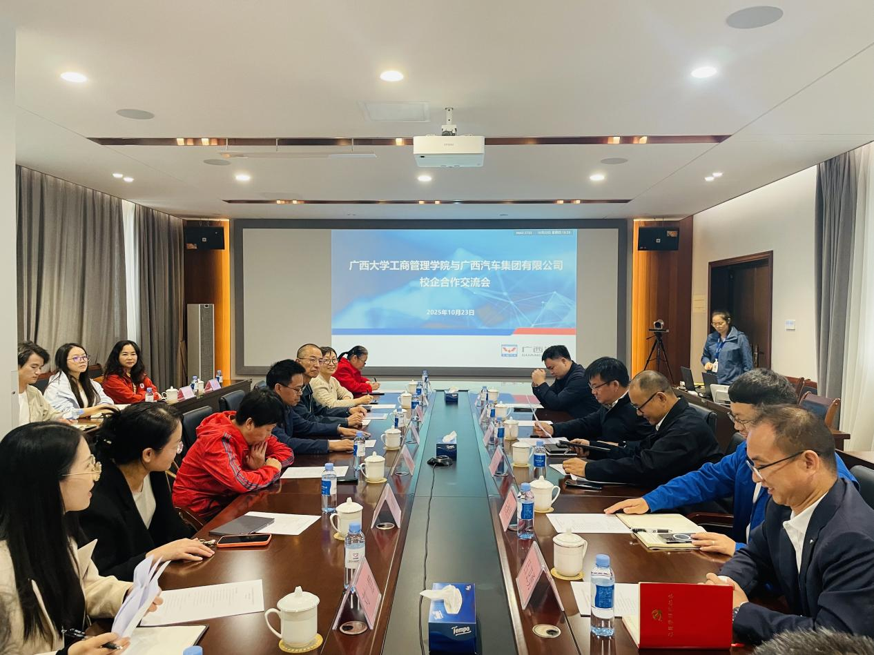 在广西汽车集团,调研组参观了总部展厅并举行校企合作座谈。座谈会由集团党委组织部部长李钦德主持,他介绍了企业人才培养战略及产业绿色发展政策,企业代表则详细解读了碳中和实施路径与碳排放管理实践。学院校友工作与政企服务办公室主任覃朝勇介绍了我院学科建设进展,希望推动双方在人才培养、双碳研究等领域深度合作。交流环节中,我院教师代表分别就国际市场战略、绿色财务、智能驾驶应用及创新体系建设提问。集团相关负责人、学院杰出校友结合学术与实践经验,系统解读了集团2016年以来的创新布局与成效,为师生理解制造业创新提供了生动范例。
