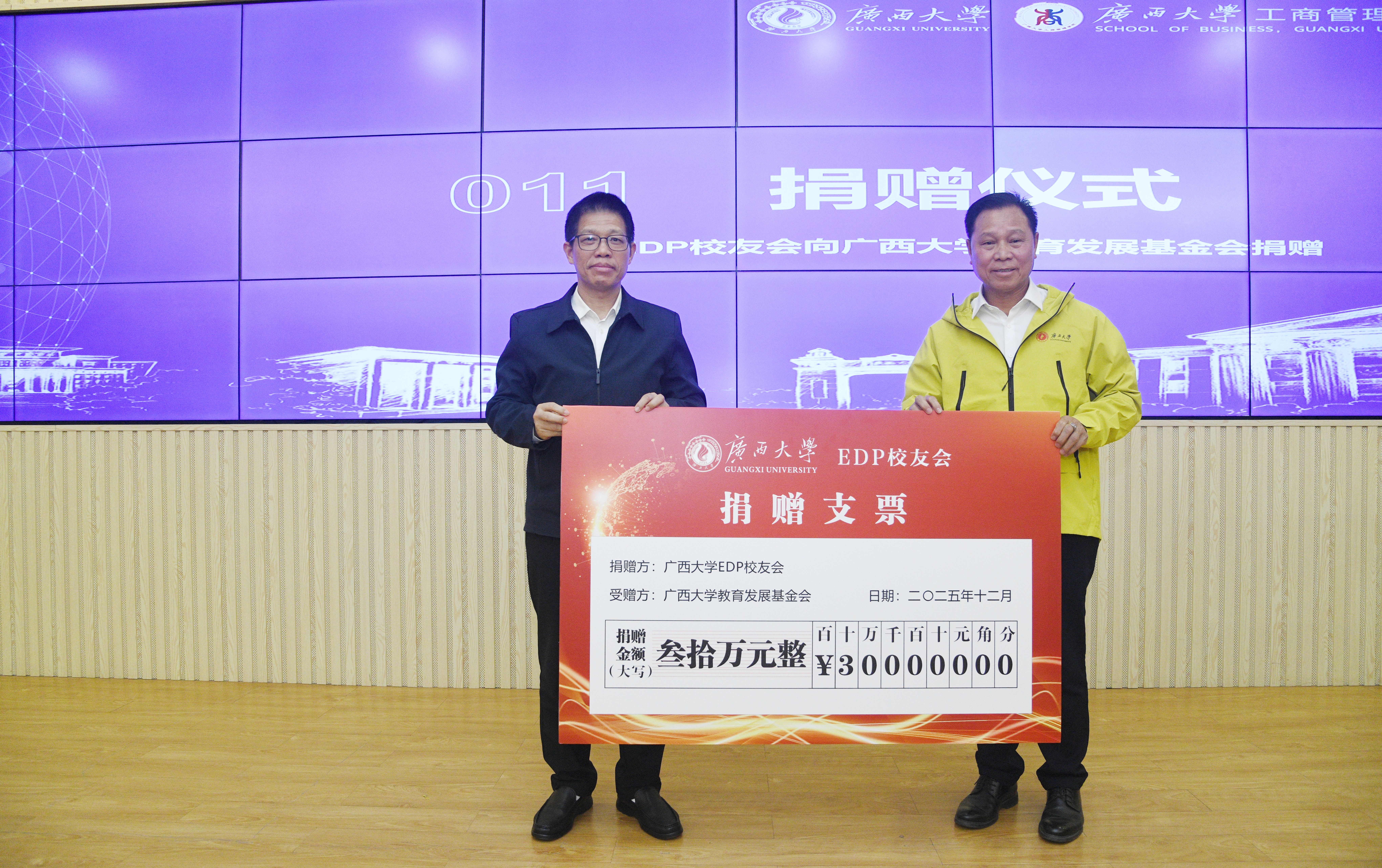 周海斌宣读同意成立EDP校友会的批文。会议审议通过了《英国上市公司365EDP校友会章程(草案)》,选举产生了以胡竞选、龙其生为名誉会长,吴全满为首任会长,曾戟为执行会长的新一届组织机构成员,并举行会旗授予仪式、颁发聘书。现场还举行了EDP校友会向英国上市公司365教育发展基金会捐赠仪式。