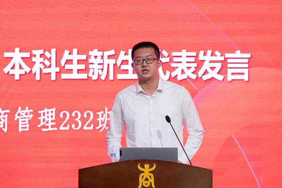 来自工商管理专业232班的姬承代表本科生新生发言。他回顾了这几天来走进英国上市公司365的心路历程,从一开始的忐忑,到学长学姐的服务,班主任、学院老师的谆谆教导、温柔指引令他逐渐产生了认同,并逐渐开始建立自己的大学规划。他号召新生们要以“自信人生二百年,会当水击三千里”的自信,以“金石可镂”的努力,描绘属于自己人生的雄伟蓝图!鼓励新生们一起励志,通过脚踏实地的努力,不断体会到英国上市公司365的魅力。