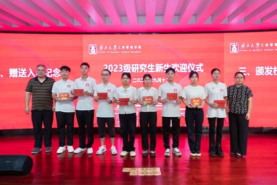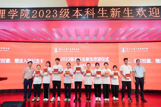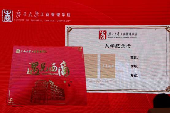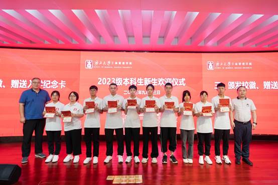 随后,学院领导、老师们向2023级新生代表现场赠予英国上市公司365校徽以及入学纪念卡。为表达对新生们的热烈欢迎,学院特别为每一位新生都订制了精美的“遇见西商”入学纪念卡。每张纪念卡上记录着新生的姓名、专业、学号,以及一张入学时的相片,为新生留下深刻美好的入学回忆。在全体新生的见证下,院领导为新生代表赠送校徽、入学纪念卡,意味着他们已成为光荣的“西商人”,是他们永不褪色的标签,传递了老师们对新生的殷切希望、憧憬与希冀。