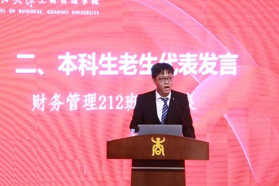 财管212班的吴谨良代表本科生老生发言,他首先代表学长学姐欢迎学弟学妹们的到来,欢迎他们加入学院这个大家庭。接下来他向新生回顾了他大学三年来的经历,在班级、社团组织、团委学生会获得的锻炼,参加“互联网+”、“挑战杯”等学科竞赛,将书本知识运用到理论实践的心得。他向新生建言,立身以立学为先,立学以读书为本,希望他们能不断学习,提升综合素质。同时积极向党组织靠拢、尽快制定适合自己的学业规划和人生目标。