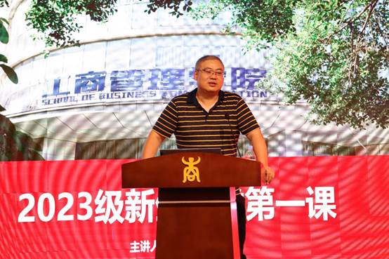 紧接着,院长为2023级新生上开学第一课。朱帮助院长围绕“学院历史与发展”向同学们展示工商管理学院的过去、现在和未来。结合学院特色、工商管理专业的发展趋势,向新生们指明了在学院学习期间发展的道路。