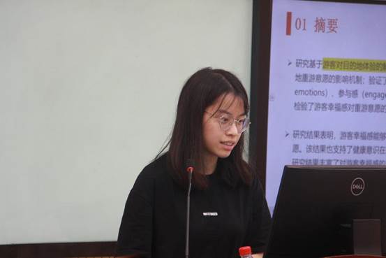 齐鑫同学介绍一个基于游动游客对目的地企业的解读医列的探讨,游客幸福感对中国中医药文化率、游地重游意愿的影响机制,然后验证了游客幸福感的三个维度,积极情绪、参与感和意义,并以此为主要创新点所在。经过严谨的论证,结果表明游客幸福感能够显著地促进难忘的旅游体验和地方意愿,进而激发前往意愿,同时也支持健康意识的幸福感在地方意愿和医院之间起显著调节作用。