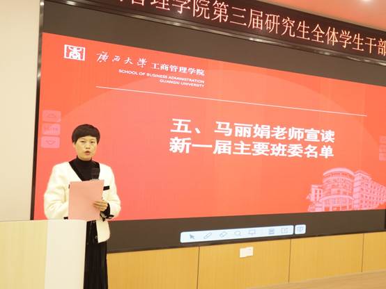会议议程第五项,学院团委书记马丽娟老师宣读新一届主要班委名单。