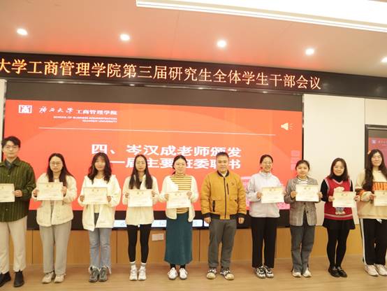 会议共六项议程,会议伊始,院团委副书记岑汉成对上一届团学组织成员的工作给予了高度肯定,并为上一届团学组织主要学生干部颁发聘书。过去一年,团学组织成员们积极开展各方面的工作,展现了学院研究生组织应有的奋进姿态。