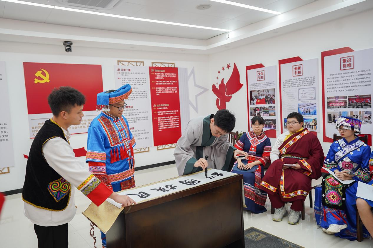 罗诚书记认真倾听学生代表们的分享,他指出,恰逢全区上下喜迎广西传统节日“三月三”,师生们身着各民族节日盛装共聚一堂,可谓是恰逢其时,不仅展示了本民族的精气神,也在交流中深刻感受到了少数民族文化的丰富多样性与独特性。他强调,学院一直高度重视并关心关注各民族学生的成长发展,教育引导各民族学生交流交往和交融,铸牢中华民族共同体意识,增强民族自豪感和归属感,希望同学们一要坚决贯彻党的民族政策,坚定对伟大祖国、中华民族、中华文化、中国共产党、中国特色社会主义的高度认同,做民族团结的拥护者;二要讲好中华民族故事,大力宣介中华民族共同体意识,做民族政策的传播者;三要自觉主动承担起铸牢中华民族共同体意识的时代重任,做铸牢中华民族共同体意识的建设者;四要胸怀天下,做构建人类命运共同体的积极实践者和推动者。