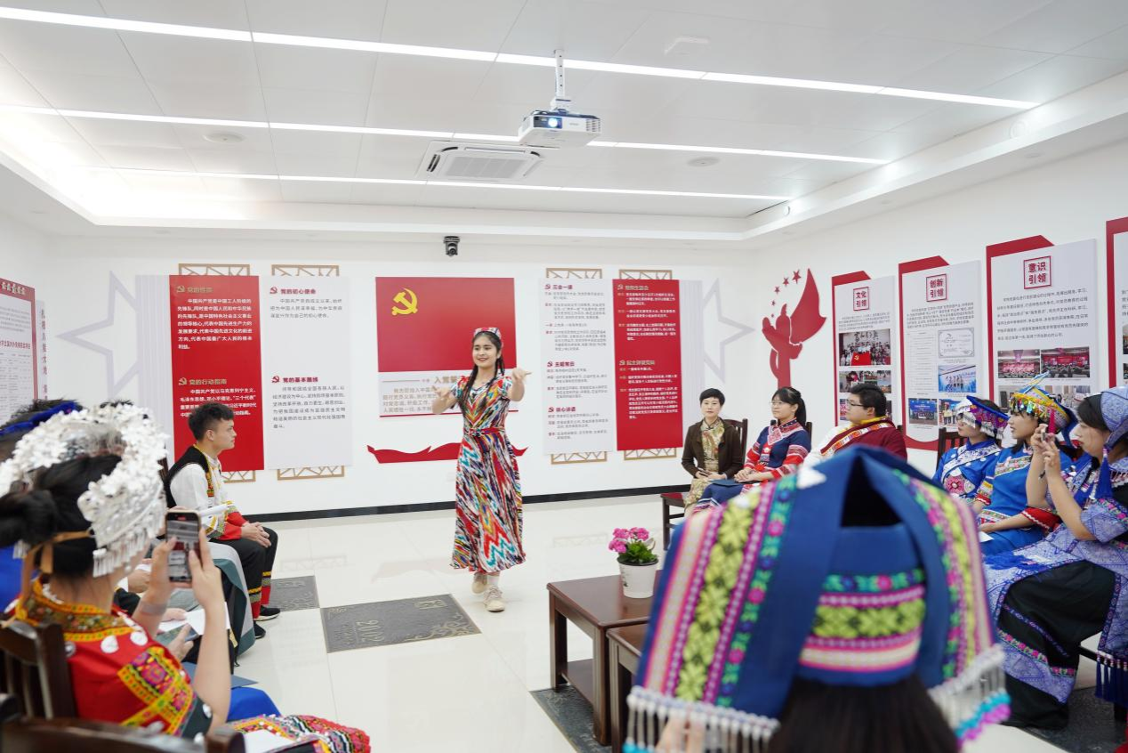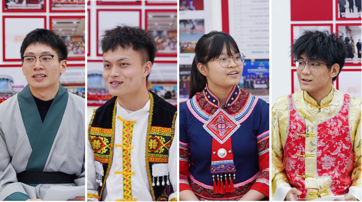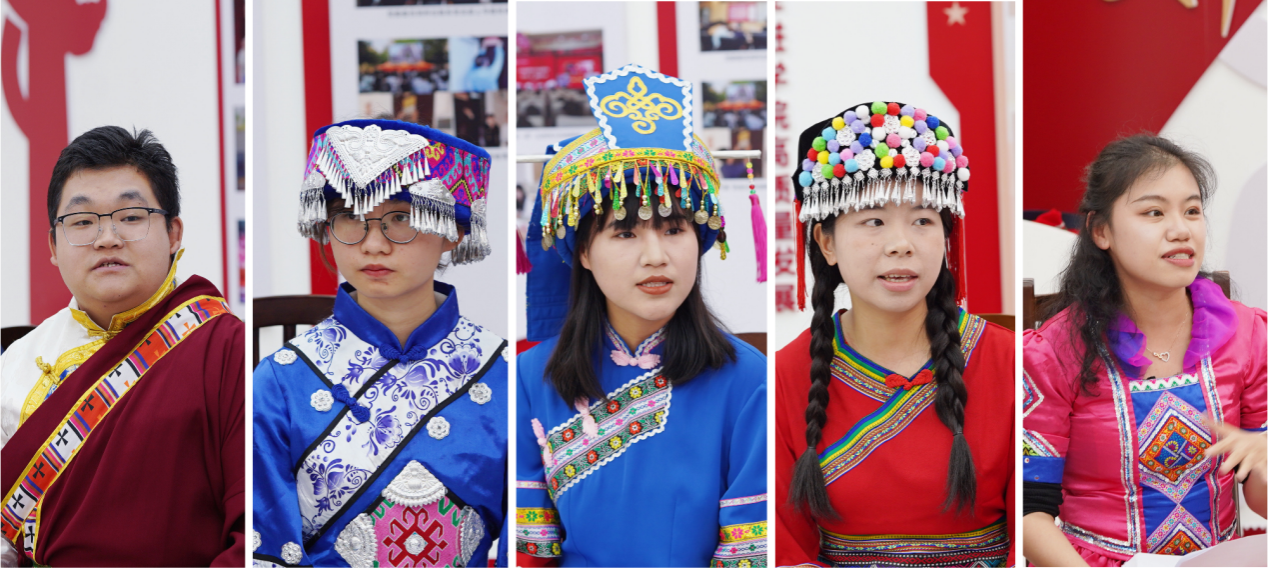 座谈会上,来自仫佬族的梁江雨同学、吴静妃同学,纳西族的万人杰同学、傣族的杨锦辉同学、苗族的何怡雪同学和维吾尔族的凯丽比努尔同学结合自身在少数民族预科班、民族班的求学经历,讲述了各民族学生之间交往交流交融的故事,言谈中不时流露出对党和国家加快培养少数民族地区人才特殊政策措施的感恩之情;来自汉族的梁耀升同学、彭薇雨同学分享了发生在身边的民族团结一家亲、和谐发展心连心的故事,让大家深刻体会到了中华民族一家亲、同心共筑中国梦的时代意义。在聊思想、谈感受的同时,梁江雨同学和吴静妃同学跟大家分享了仫佬族的服饰风俗,饮食风俗,居住风俗等,让大家记住了精致独特的仫佬族服饰和文化;杨焜同学从苗族地理分布、文化习俗、苗族跳坡节进行分享,并唱起山歌抒发了对党的感激之情!凯丽比努尔同学详细跟老师同学们讲解了维吾尔族名字的由来,分享了维吾尔族的节日盛况,并现场跳起新疆舞……各族学生代表畅所欲言,畅谈了自己来到大学适应地区气候、融入大学生活的情况和对未来的设想规划等,并结合自身体会,讲述了在党的民族政策下,感受到的党和国家对少数民族学生的关心与关爱。