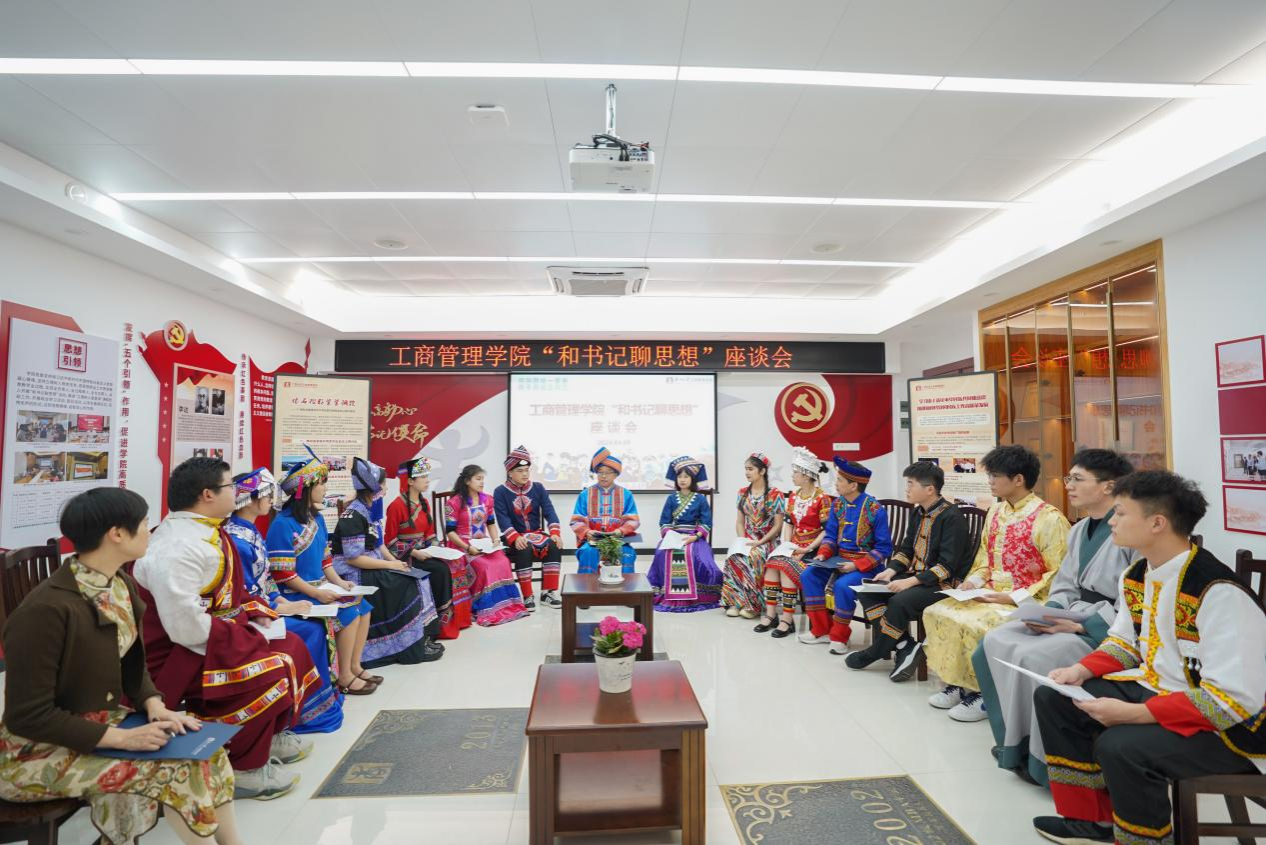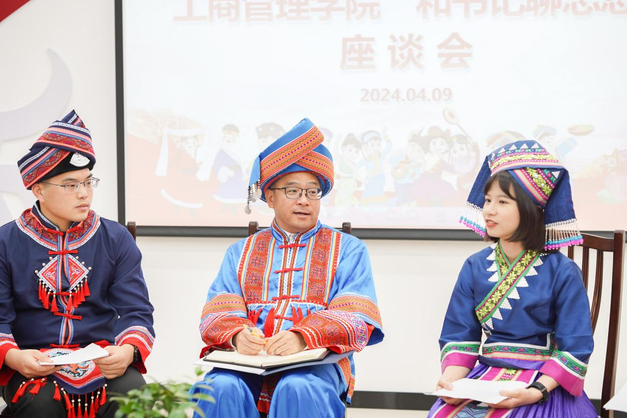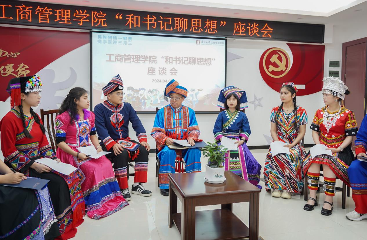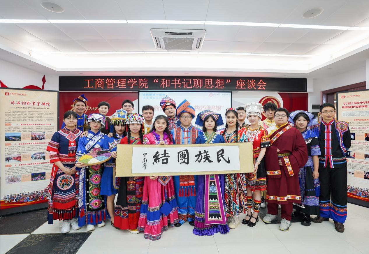 喜迎广西三月三,共绘民族团结同心圆。4月9日下午,我院在党员活动室举行各族学生代表“和书记聊思想”座谈会,学院党委书记罗诚身着民族服装与壮族、汉族、仫佬族、苗族、瑶族、维吾尔族、纳西族、傣族、满族等14名各族学生代表欢聚一堂,共庆佳节。学院党委副书记肖克宁,团委书记马丽娟、组织员黄照温、辅导员郁文丹参与座谈。