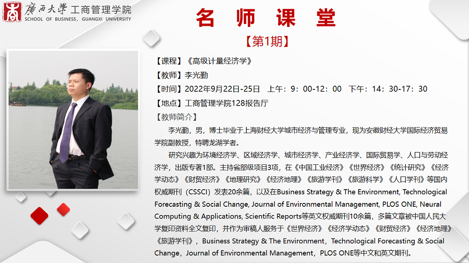9月25日,李老师为期四天的《高级计量经济学》课堂在掌声和叹息声中落下帷幕。此次课堂让大家耳目一新,同学们都感觉意犹未尽,收获颇多,大家纷纷表示“李老师的课真的干货满满,几天的学习太有收获了!”