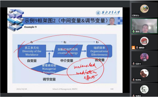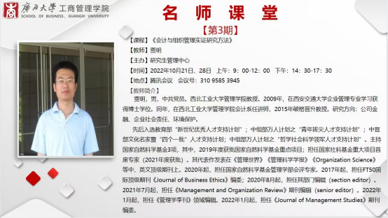 西北工业大学管理学院贾明教授应邀分别于2022年10月21日、10月28日为我院2022级硕博研究生和其他师生进行为期2天的《会计与组织管理实证研究方法》系列课程授课。此次课程以《管理研究的思维方式》为主题,主要通过“腾讯会议”以学术讲座形式在线上开展。