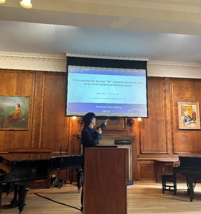 王子升同学参会的论文题目为:Forecasting the marine “3E” systems based on new grey multivariable prediction model(基于新灰色多变量预测模型的海洋“3E”系统预测)。该论文实证研究提出了基于灰色模型MGM(1,M)的IBMGM(1,M)模型,该模型适用于"小样本、贫信息"的情况。与传统的MGM(1,M)模型相比,新的模型通过积分改进了背景值,并引入了L2正则化系数,以减轻计算中的病态问题,从而提高模型的准确性和稳定性。为验证新模型的有效性和准确性,本文将其与传统灰色模型GM(1,1)、MGM(1,M),以及神经网络预测模型和传统线性回归模型进行了对比。结果表明,新的IBMGM(1,M)模型在预测精度和稳定性方面均优于传统模型。并对中国海洋经济,海洋生态环境以及海洋新兴产业体系进行了预测,为相关政策的制定提供了数据支持。