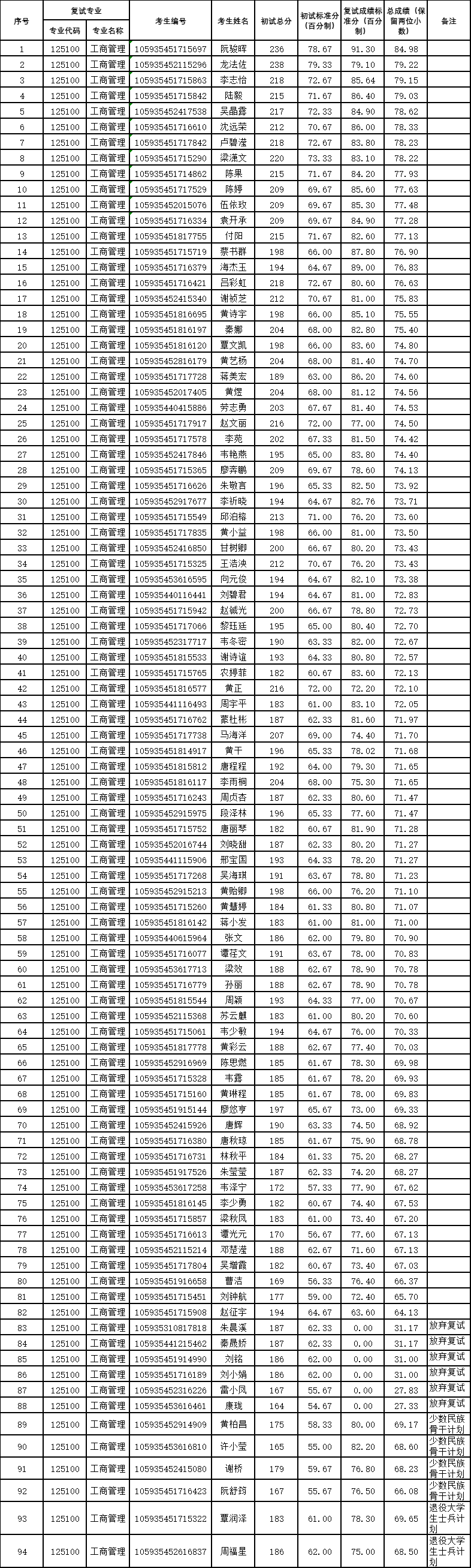英国上市公司365工商管理学院2025年工商管理硕士(非全日制MBA02方向)一志愿考生复试成绩公示如下。公示时间为2025年3月24日-2025年3月28日。公示期间,如有异议,请联系工商管理学院MBA教育中心反映,电话:0771-3299887。