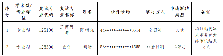 根据《2026年全国硕士研究生招生工作管理规定》第二十五条规定:“对服役期间获得三等战功、二等功以上奖励或者二级以上表彰,符合全国硕士研究生招生考试报考条件的退役人员,可申请免初试攻读硕士研究生。”“符合免初试资格的考生,应在教育部规定的全国统考报名时间内登录“全国推荐免试攻读研究生(免初试、转段)信息公开暨管理服务系统”(网址:https://yz.chsi.com.cn/tm)报名,逾期不得补报。”现收到陈树强、胡皓的退役军功人员报名参加第一志愿考生复试的申请,名单公示如下: