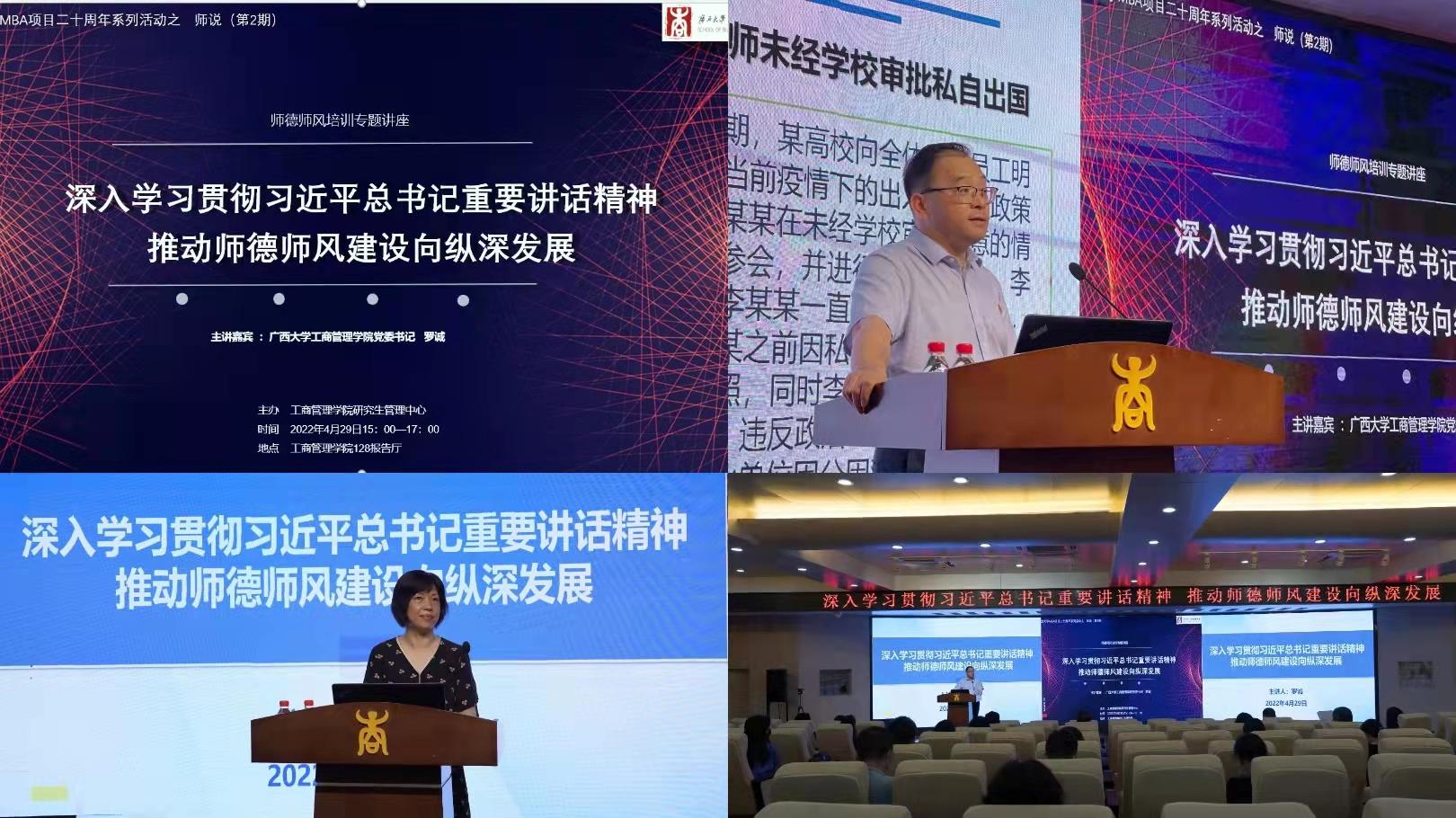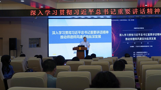 为深入学习贯彻落实习近平总书记在中国人民大学考察时的重要讲话精神,深入学习贯彻落实习近平总书记关于教师特别是师德师风的重要论述,深入学习贯彻落实中央、教育部、自治区和学校颁布的高校教师队伍建设、师德师风建设的相关文件,进一步加强师德师风建设,带动广大教师自觉增强为党育人、为国育才、立德树人的使命感和责任感,营造风清气正的教育教学环境,4月29日下午,工商管理学院在学院128报告厅举办师德师风培训专题讲座。讲座由学院党委书记罗诚主讲,院党委副书记、院长朱帮助等全体教职员工参会学习,学院研究生管理中心常务副主任叶映副教授主持讲座。