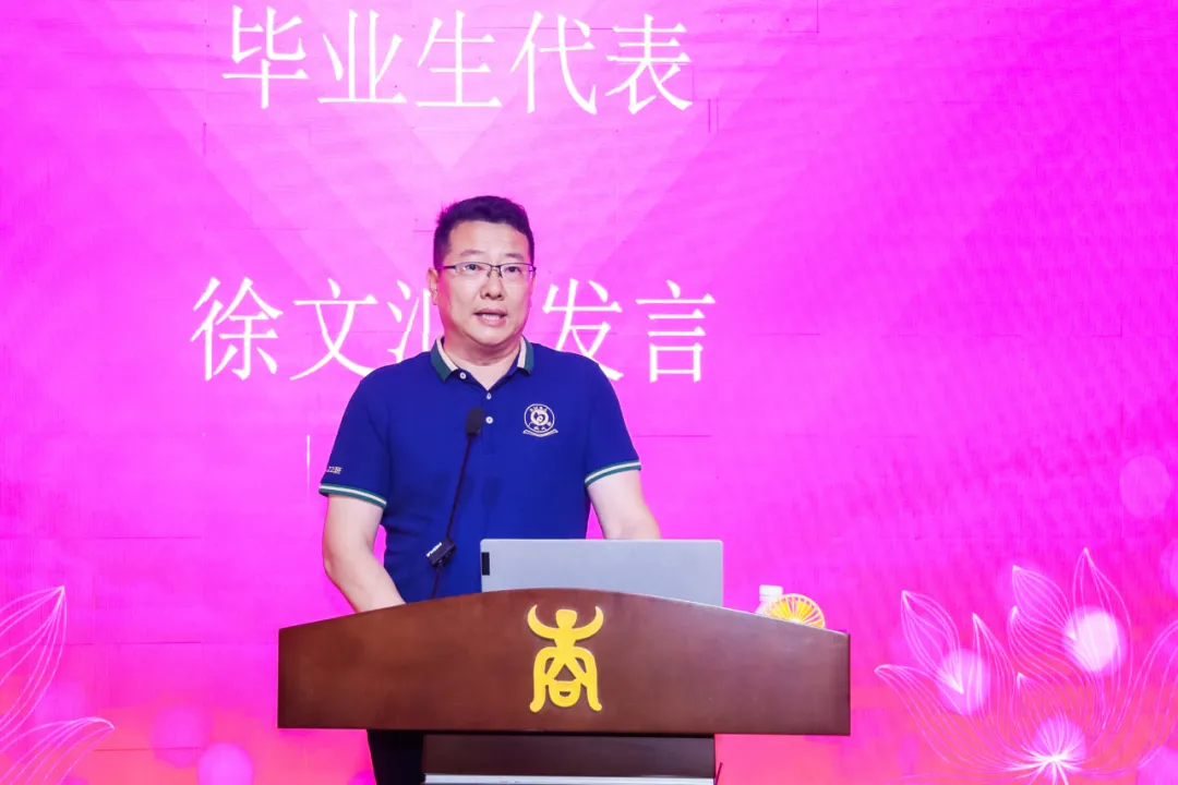 毕业生代表EMBA22班徐文汇感谢无私奉献的老师,并且为同学们送上真挚的祝福,他祝愿同学们勇往直前,不惧挑战;希望同学们友谊地久天长;祝福同学们前程似锦,再创辉煌。