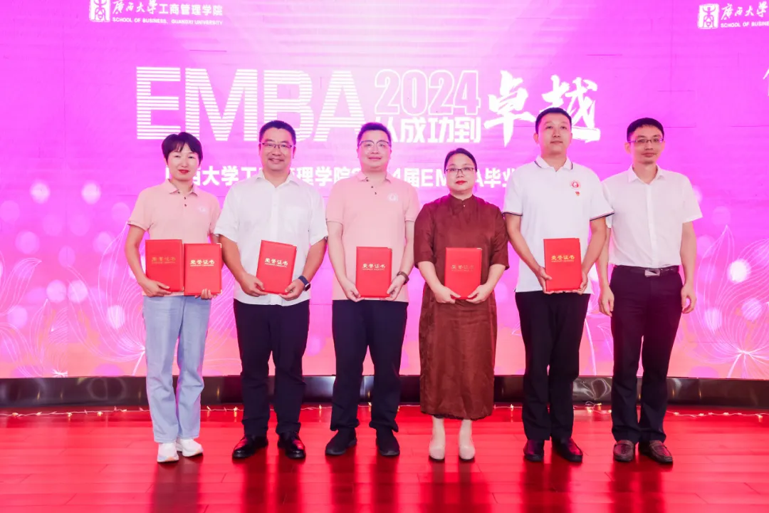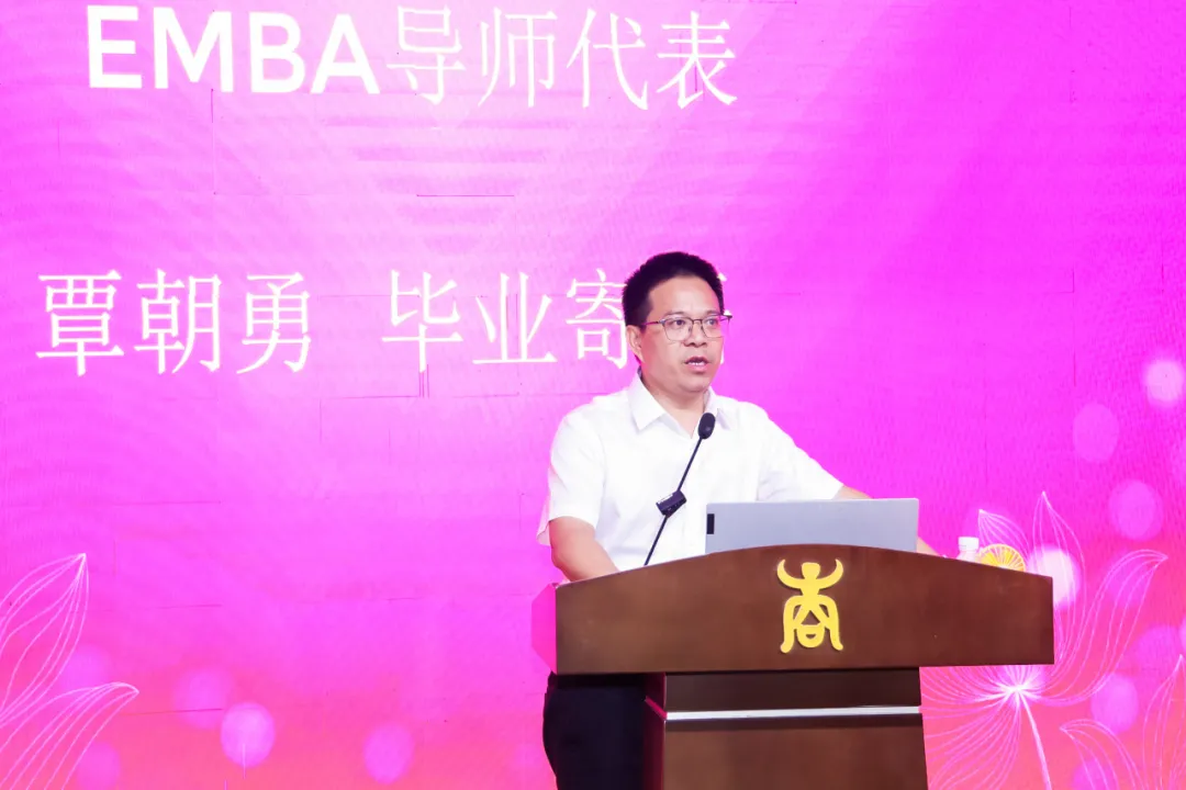 导师代表唐玉生、覃朝勇、EMBA教育中心主任宁雪莲、EMBA班主任代表黄子芸、邓丹分别为EMBA毕业生作毕业寄语,表达了对同学们深深的情感与不舍。