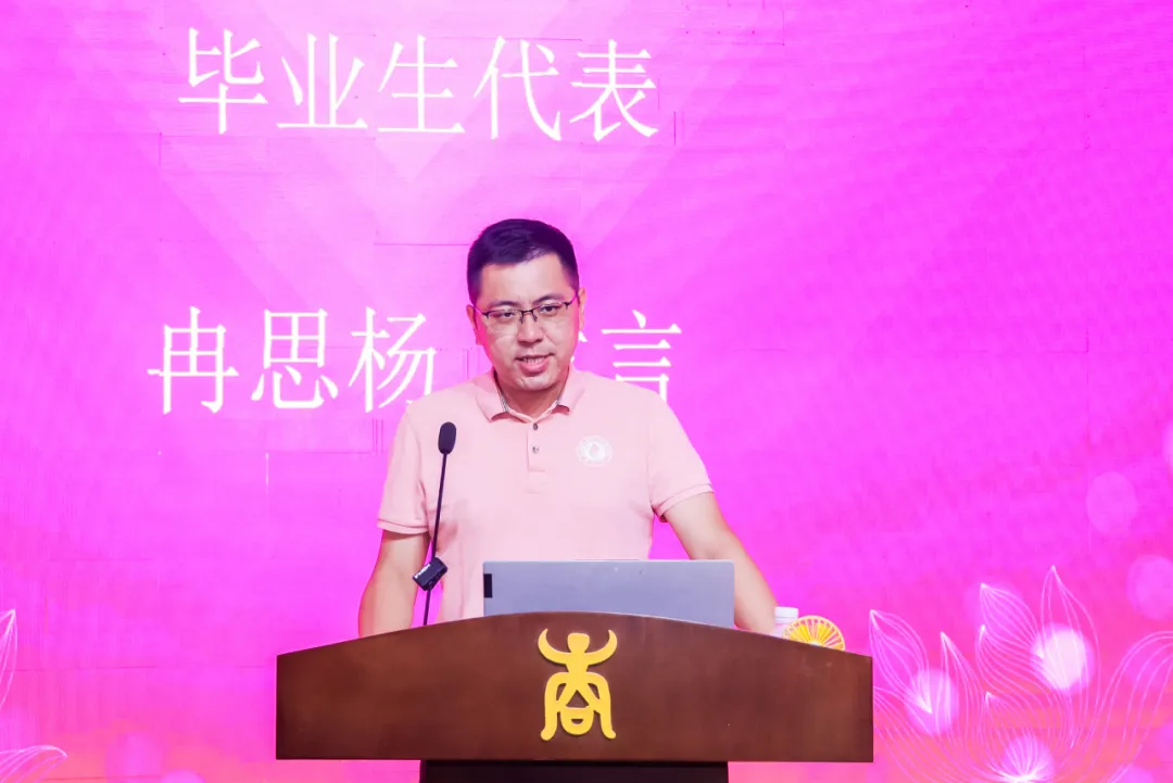 毕业生代表EMBA21班冉思杨对老师们的辛勤付出、同学们的相互扶持表示衷心地感谢。他深情地回忆了EMBA两年快乐、充实的学习时光,并表示将怀着感恩之心继续前行。