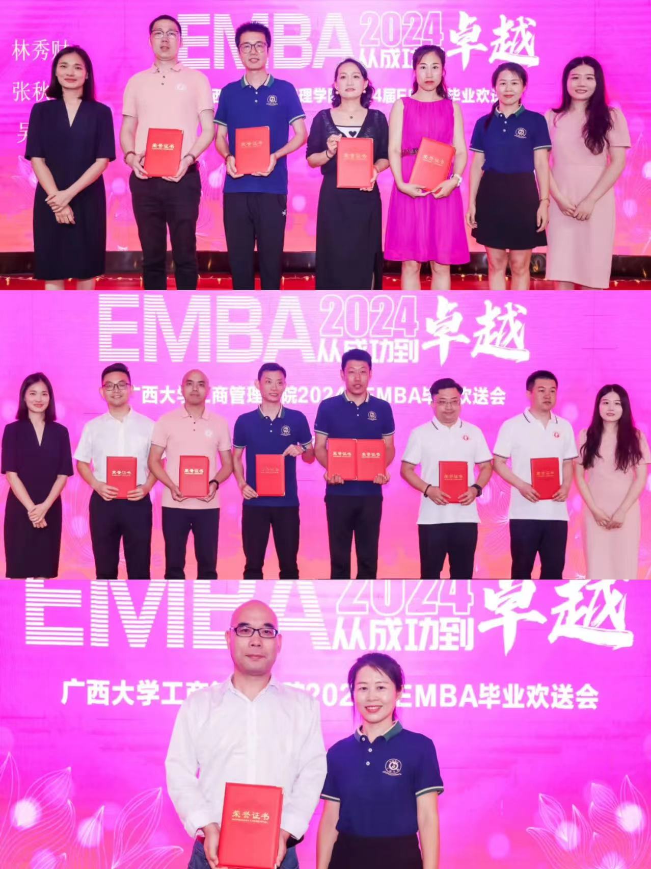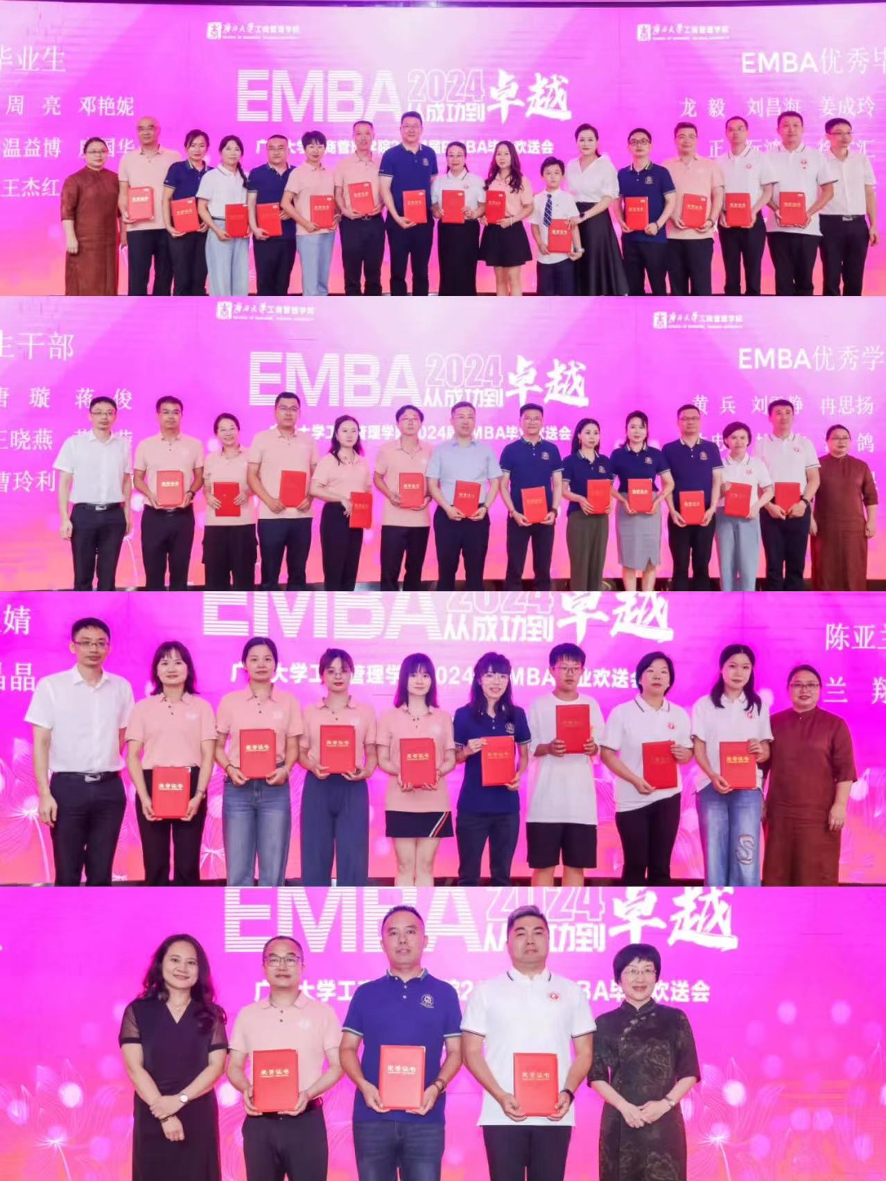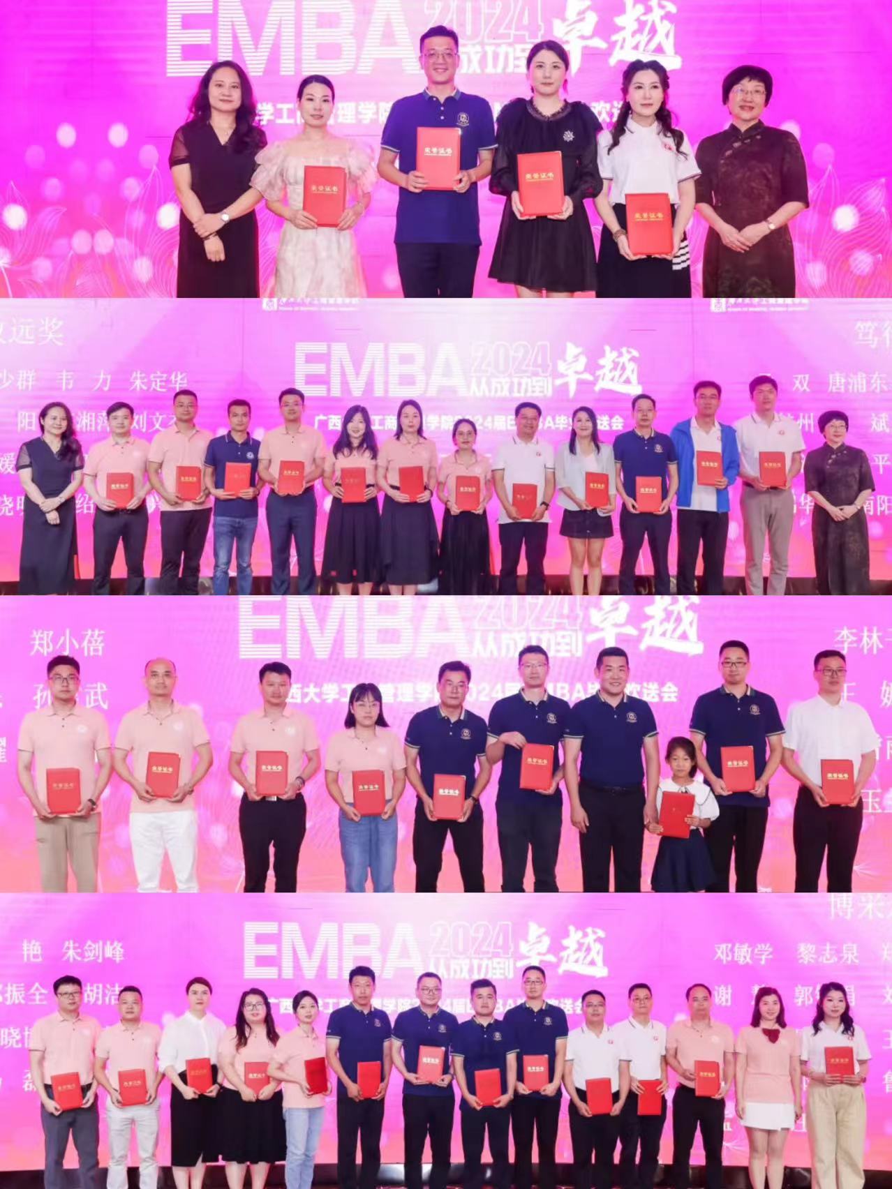 为同学们颁发的奖项有:EMBA优秀毕业生、EMBA优秀学生干部、最具亲和力奖、最具才华奖、最具魅力奖、笃行致远奖、踔厉奋发奖、博采众长奖、笃志好学奖、弘毅奖、勇毅奖。