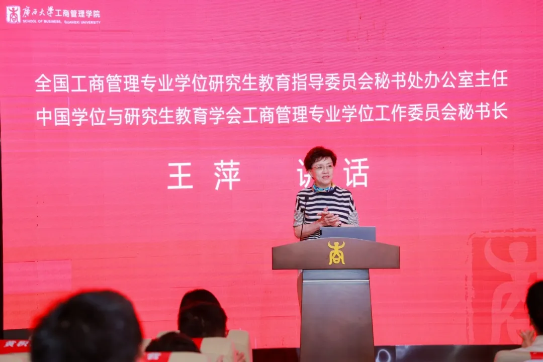 朱帮助院长首先代表学院党政领导班子和全体教职工,对2024级EMBA新生的到来表示热烈欢迎,对全国工商管理专业学位研究生教育指导委员会秘书处办公室主任、中国学位与研究生教育学会工商管理专业学位工作委员会秘书长王萍老师亲临入学仪式现场,以及长期以来对工商管理学院的关怀和指导表示衷心的感谢。朱帮助院长向新生们简要介绍了学院的基本情况,在同学们即将开启EMBA学习之际,他提出三点期望,一是持续学习,开放创新;二是跨界融合,拓宽视野;三是责任担当,贡献社会,并祝愿同学们能够登高望远,不惧挑战,学有所成、学有所获。