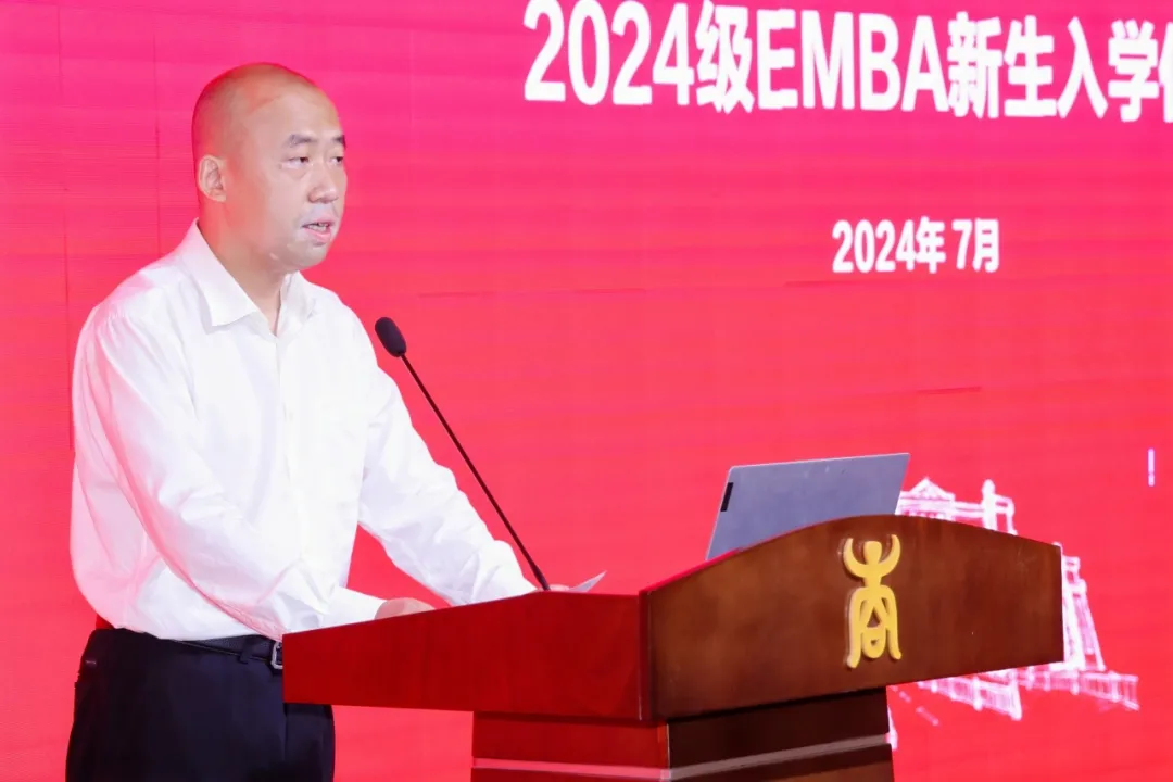 老生代表葛靖代表往届EMBA师兄师姐,对2024级EMBA新生加入EMBA大家庭表示热烈的欢迎。他分享了过去一年EMBA学习期间四个关键词——“挑战”、“勤学”、“交流”、“时间管理”的收获与感悟。最后他祝愿同学们在学习和事业上取得更大的成就,也祝愿学院EMBA项目越办越好。