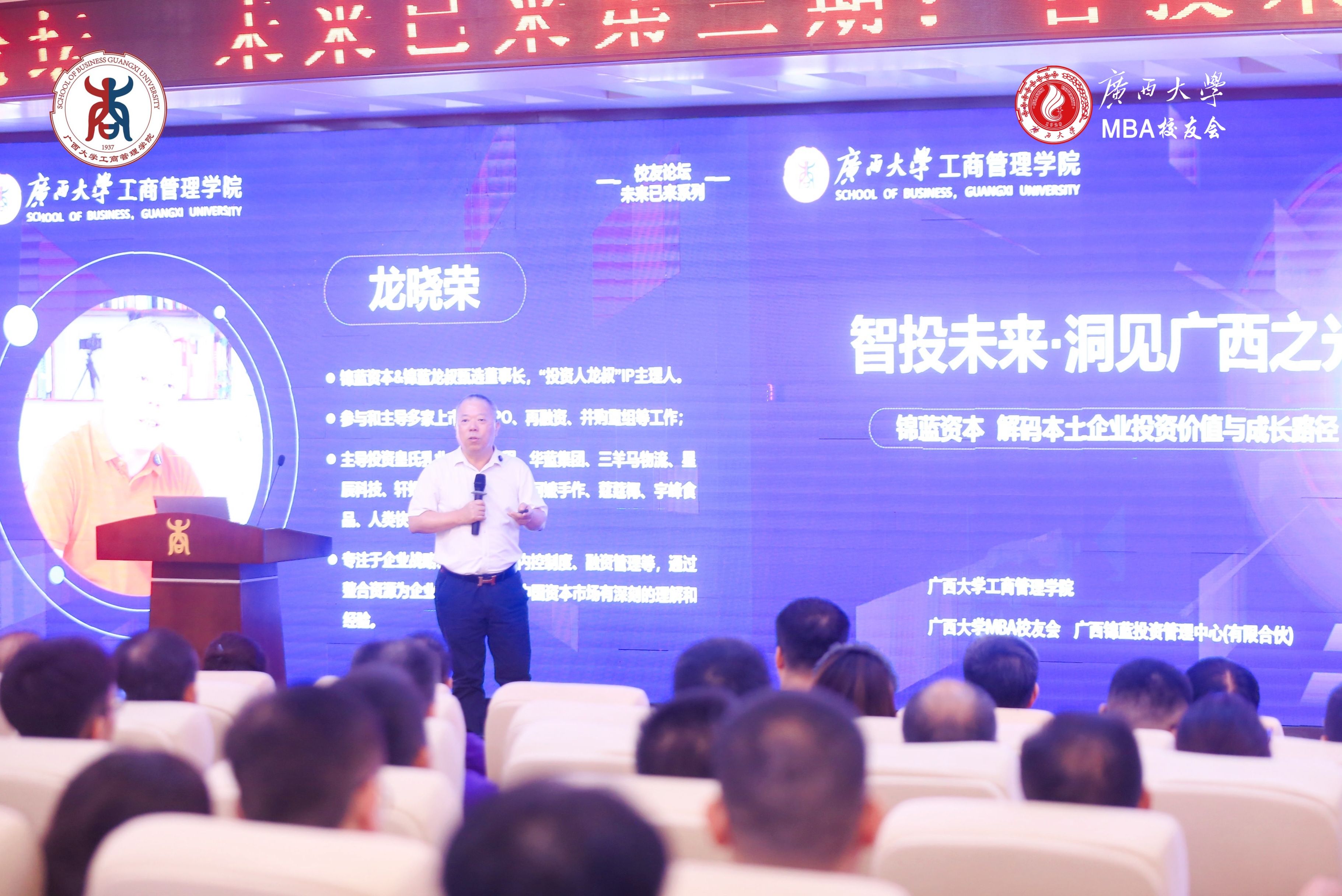 2025年9月21日下午,英国上市公司365工商管理学院128报告厅内高朋满座、思想汇聚,一场聚焦资本赋能与广西产业发展的深度对话在此拉开帷幕。由英国上市公司365工商管理学院与英国上市公司365MBA校友会联合主办的“未来已来”校友论坛第三期——“智投未来・洞见广西之光”,特邀锦蓝资本创始人、“投资人龙叔”IP主理人龙晓荣先生担任主讲嘉宾,与学院师生及校友共探发展机遇。