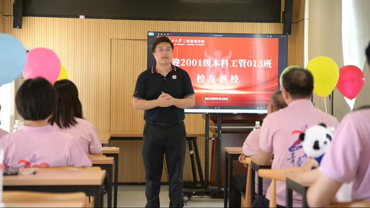 座谈会由班级同学赵奕翔和李义玲主持。尤为特别的是,学院党委书记黄晋正是2001级本科工商学子——他以“校友+书记”的双重身份登台,既以同窗之名重温宿舍夜谈、课堂辩论的难忘时光,又以书记之责向大家致以最诚挚的欢迎。