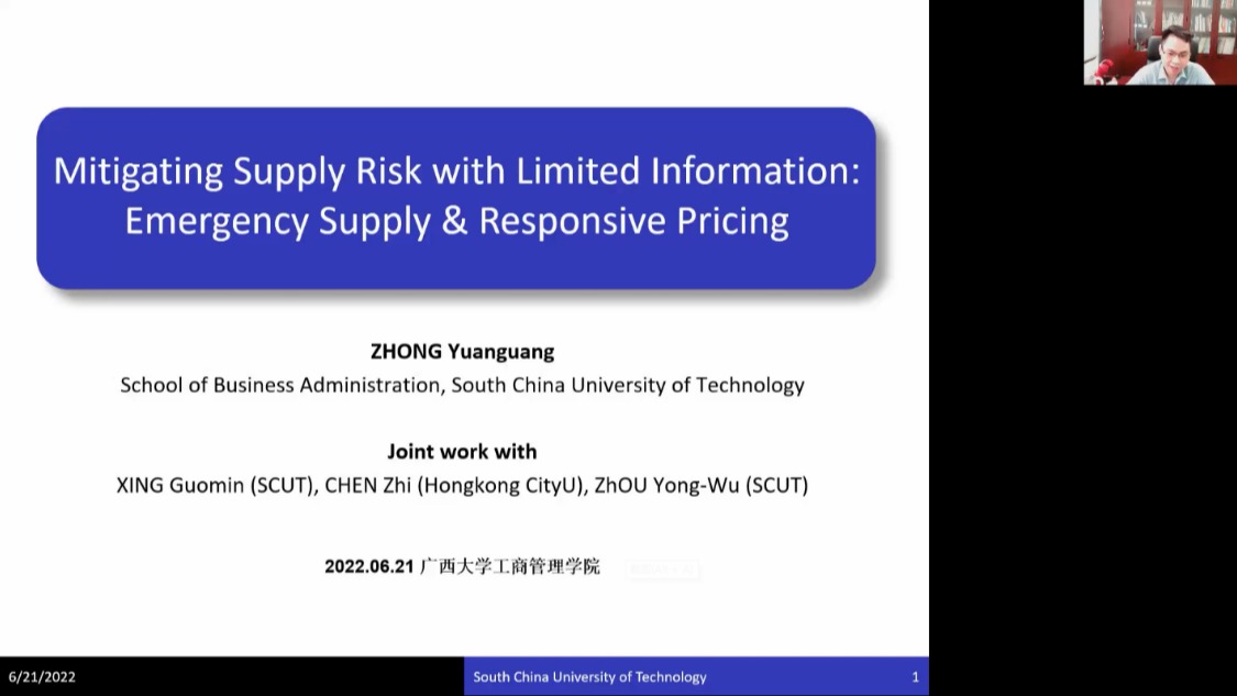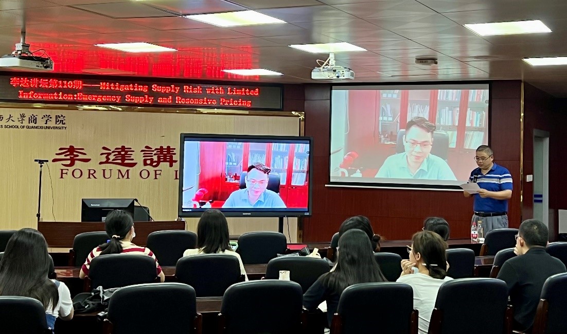 6月21日,华南理工大学工商管理学院钟远光教授应邀做客我院第110期李达讲坛,与我院师生们分享他的论文成果——“Mitigating Supply Risk with Limited Information: Emergency Supply and Responsive Pricing”。我院院长朱帮助教授主持本次讲坛,线上线下多名师生参与了聆听和交流。