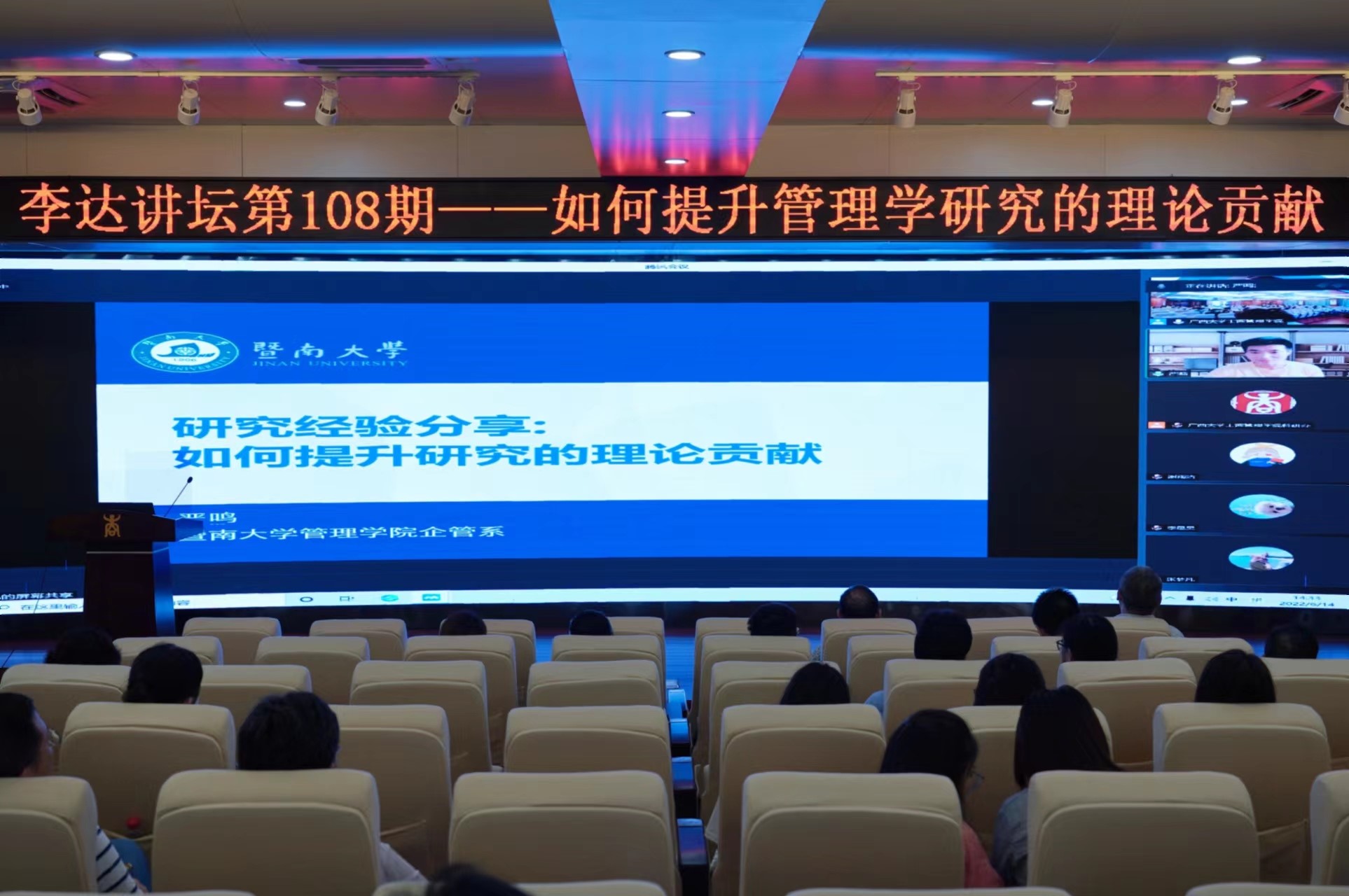 应我院邀请,暨南大学管理学院严鸣教授于2022年6月14日和6月16日做客我院“李达讲坛”,以“如何提升管理学研究的理论贡献”为题为师生们做了两场精彩的学术报告。讲坛由我院院长朱帮助教授主持,学院全体专任教师以及部分博士生、硕士生到场聆听和学习交流。
