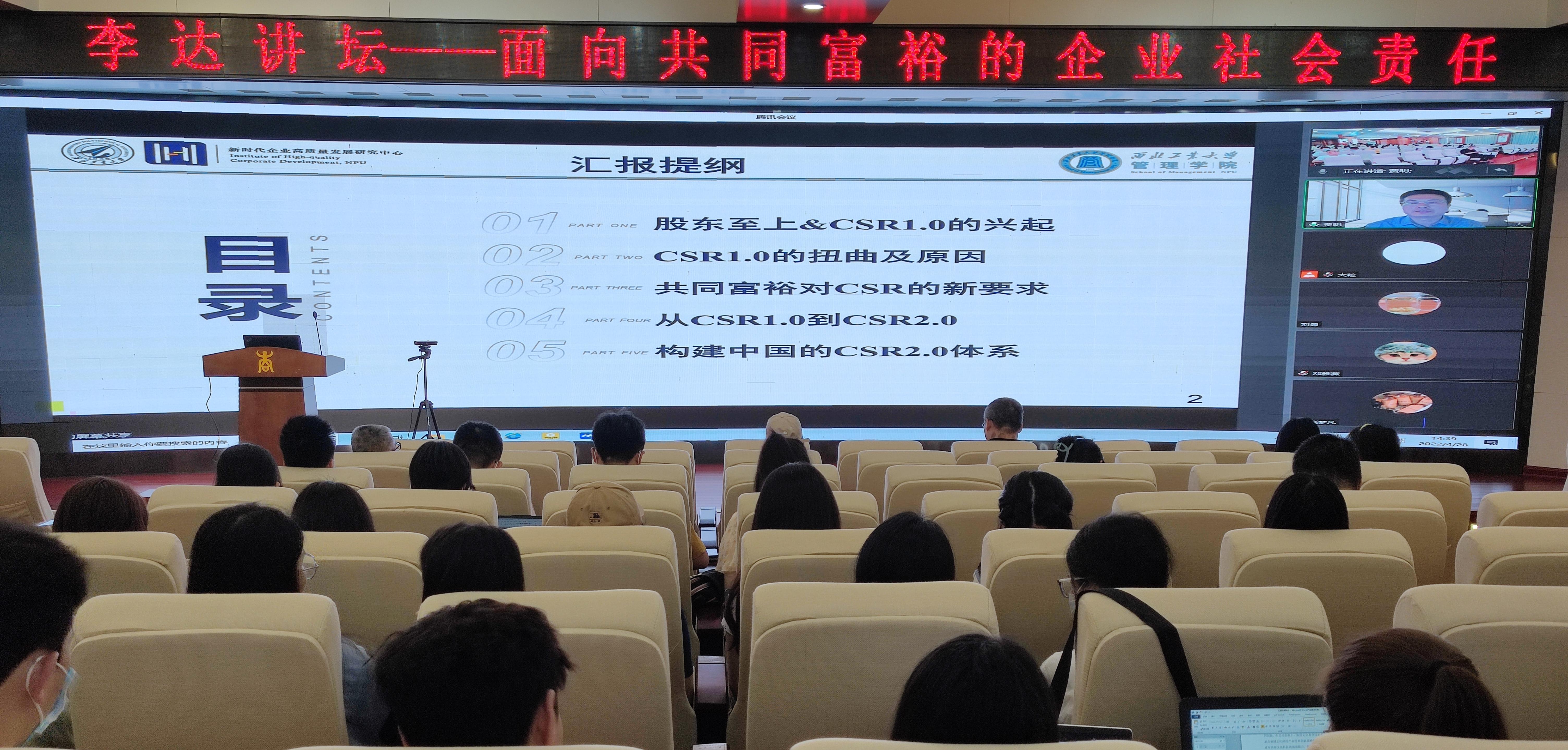 2022年4月28日下午,西北工业大学管理学院贾明教授应邀做客我院第99期“李达讲坛”,带来题为“面向共同富裕的企业社会责任”的学术研究分享。讲坛在线上和线下同时进行,约120名师生参加。本次讲坛由我院院长朱帮助教授主持。