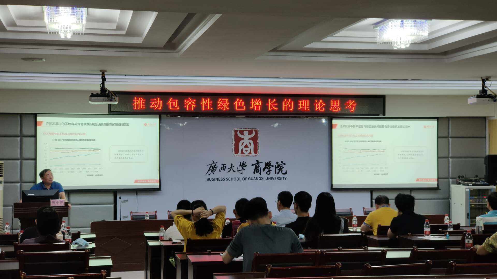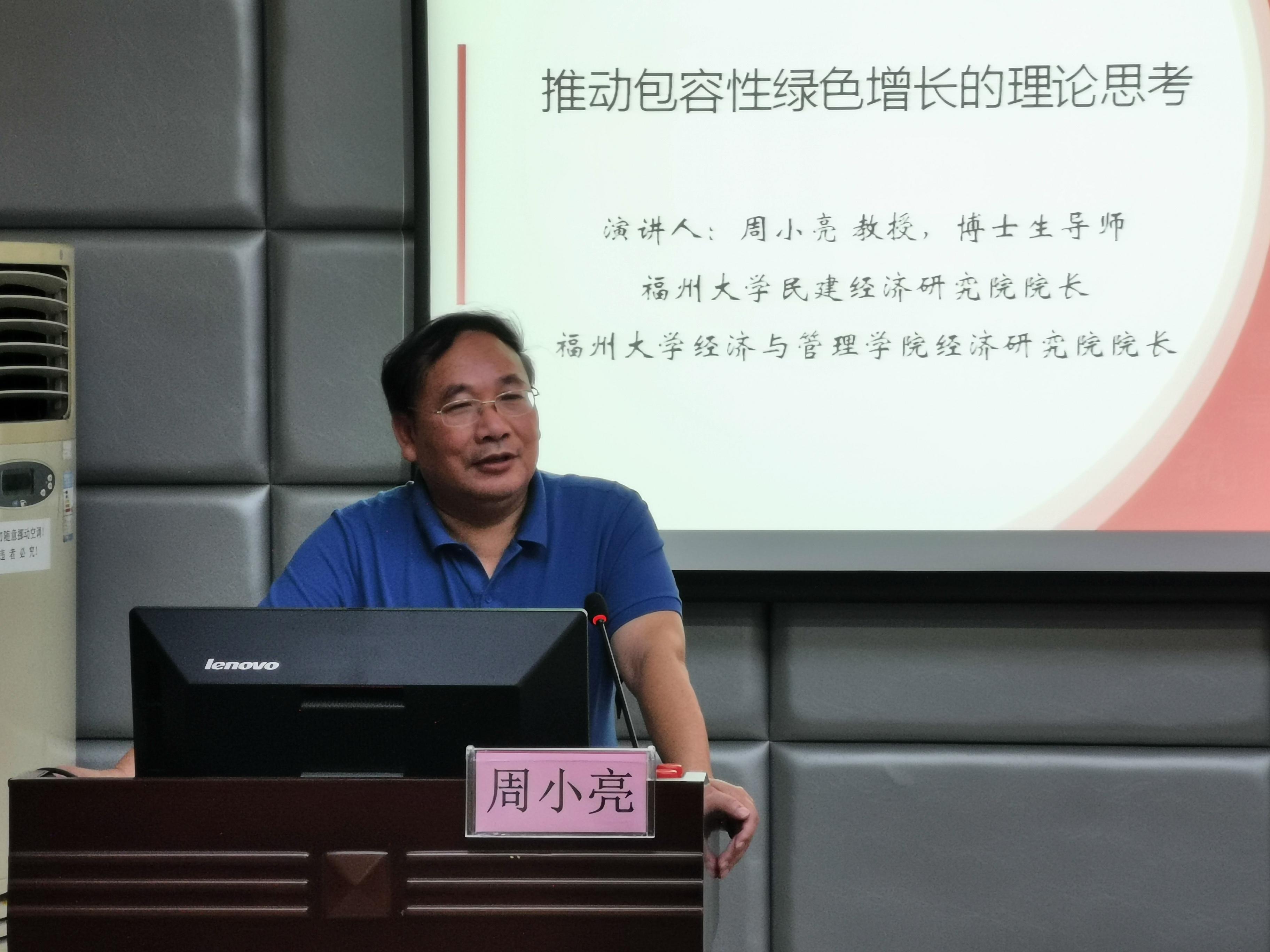 7月10日,福州大学民建经济研究院院长、福州大学经济与管理学院经济研究院院长周小亮教授应邀来我院进行学术交流。上午8点30分,周小亮教授在商学院124报告厅进行了主题为“推动包容性绿色增长的理论思考”的学术报告。报告由商学院学术院长李光辉教授主持。
