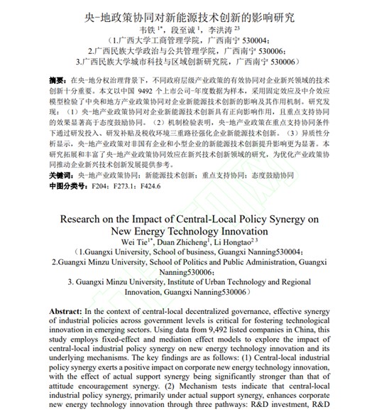 近日,我院企业管理系韦铁教授、博士研究生段至诚和广西民族大学李洪涛讲师的研究成果《央-地政策协同对新能源技术创新的影响研究》在创新管理领域中文高水平期刊《科研管理》网络首发。《科研管理》期刊为CSSCI来源期刊、AMI权威期刊、国家自然科学基金委员会管理科学部遴选和认定的管理科学A级重要期刊,2024年影响因子4.391。