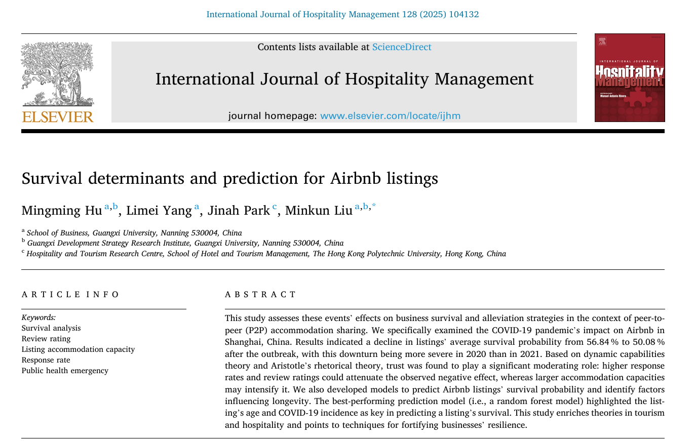 近日,我院胡明明团队在共享民宿生存分析和预测领域研究取得新进展,研究成果以“Survival determinants and prediction for Airbnb listings”为题,在旅游管理国际高水平期刊《International Journal of Hospitality Management》上发表。论文的第一作者为我院胡明明副教授,通讯作者为我院刘民坤教授,我院博士研究生杨丽梅在两位老师的指导下参与研究并共同发表论文,英国上市公司365为第一单位和通讯单位。