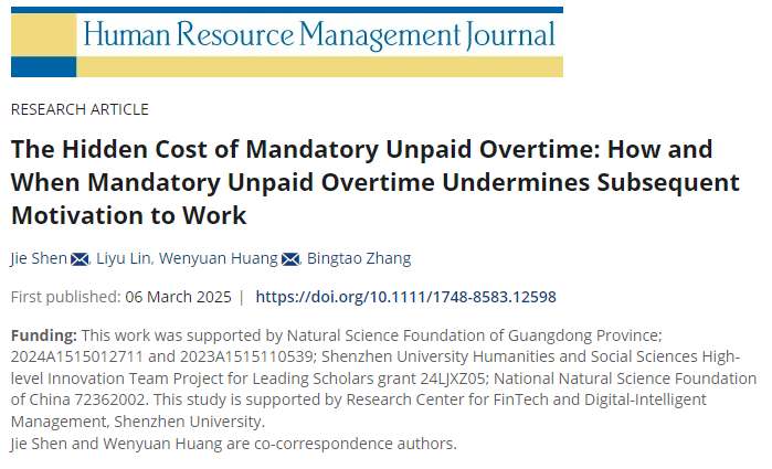 近日,我院黄文远老师在人力资源管理领域研究取得新进展,利用日记记录和人工智能面部识别技术新型研究方法,探讨无偿性强制加班对员工工作动机的影响作用。相关成果以“The Hidden Cost of Mandatory Unpaid Overtime: How and When Mandatory Unpaid Overtime Undermines Subsequent Motivation to Work”为题,在人力资源管理领域国际顶级期刊《Human Resource Management Journal》发表。论文合作者包括深圳大学沈捷教授及其硕士研究生林丽玉、博士研究生张冰涛。