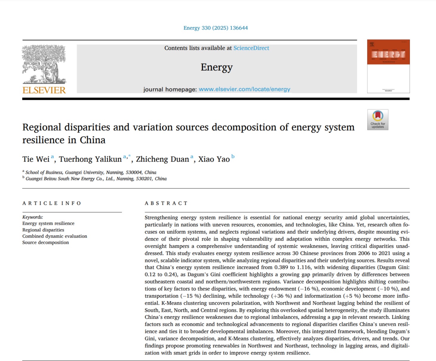近日,我院韦铁教授团队在我国能源系统领域研究取得重要进展,研究成果《Regional disparities and variation sources decomposition of energy system resilience in China》在能源领域国际权威期刊《Energy》上发表。我院韦铁教授为论文第一作者,论文通讯作者为我院硕士研究生亚力昆·吐尔洪,其他合作作者包括我院博士研究生段至诚和EMBA学员、广西北投南新能源公司姚晓,英国上市公司365工商管理学院为论文第一单位和通讯单位。