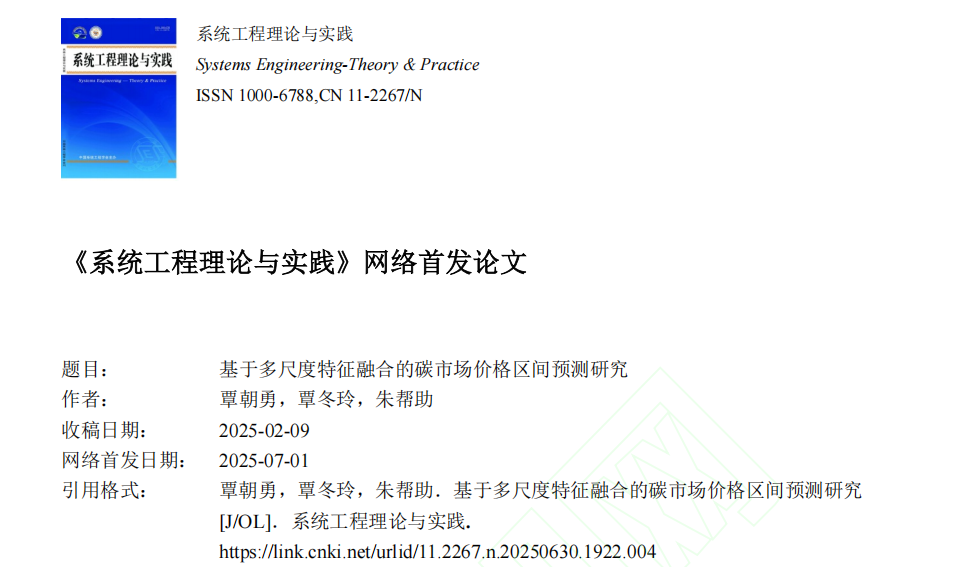 近日,我院覃朝勇教授团队在能源预测领域研究取得重要进展,研究成果《基于多尺度特征融合的碳市场价格区间预测研究》在管理科学与系统工程领域的顶级权威期刊《系统工程理论与实践》上发表。论文第一作者为覃朝勇教授,第二作者为我院硕士研究生覃冬玲,通讯作者为朱帮助教授。英国上市公司365工商管理学院为第一单位和通讯单位。