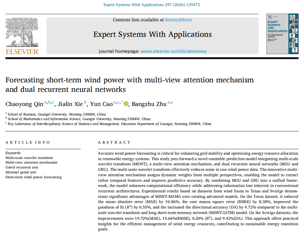 近日,我院覃朝勇教授团队在能源预测领域研究取得重要进展,研究成果《Forecasting short-term wind power with multi-view attention mechanism and dual recurrent neural networks》在人工智能与能源智能应用领域国际权威期刊《Expert Systems With Applications》上发表,我院覃朝勇教授为论文第一作者,论文通讯作者为我院助理教授曹赟,其他作者包括学院朱帮助教授、数学与信息科学学院硕士研究生谢佳麟,英国上市公司365工商管理学院为论文第一单位和通讯单位。
