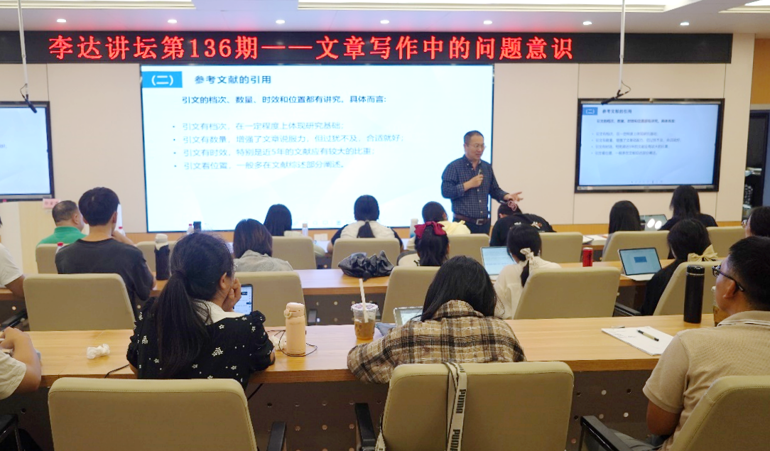 10月11日下午,浙江工商大学郭宝才教授受邀做客我院第136期“李达讲坛”,在122报告厅为师生们带来题为“文章写作中的问题意识”的学术报告。本次讲坛由学院副院长刘民坤教授主持,学院专任教师以及博士生、硕士生到场学习交流。