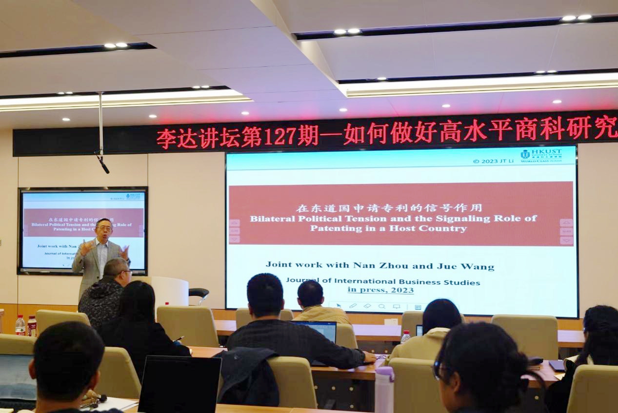 11月13日,香港科技大学商学院利国伟商学讲席教授、管理学系讲座教授、科大商学院商业战略与创新研究中心主任李家涛教授应邀做客我院第127期“李达讲坛”,以“如何做好高水平商科研究”为题作学术报告。讲坛由学院院长朱帮助教授主持,我院专任教师以及部分博士生到场聆听并交流学习。